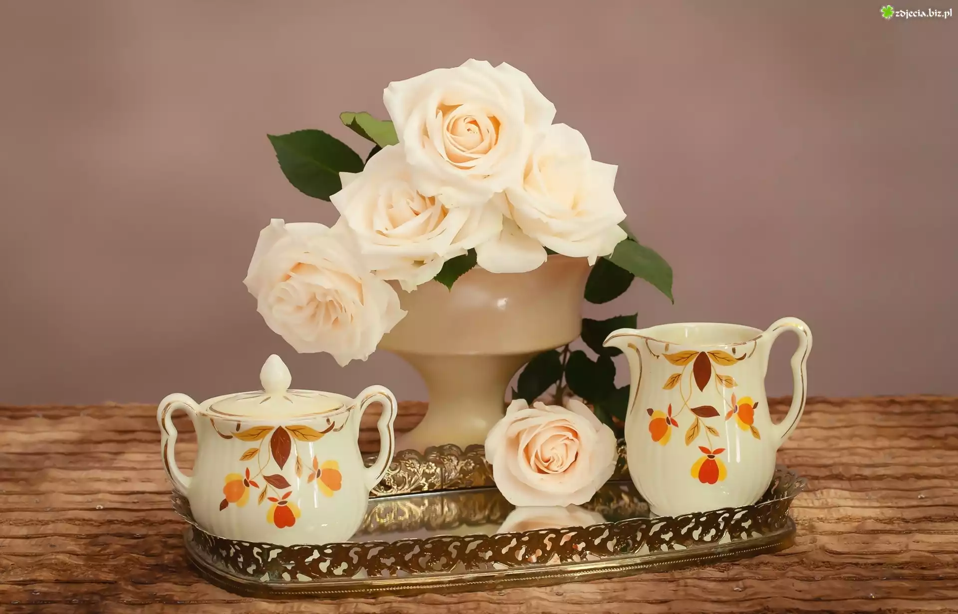 Zdjęcie Kompozycja, Bukiet, Róże, Flakon, Dzbanek