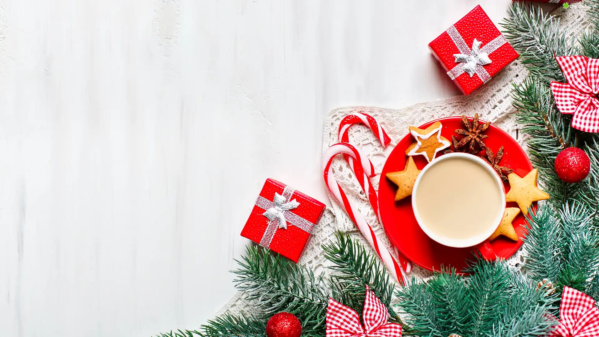 Zdjęcie Kompozycja, Kawa, Filiżanka, Ciasteczka, Gałązki, Prezenty