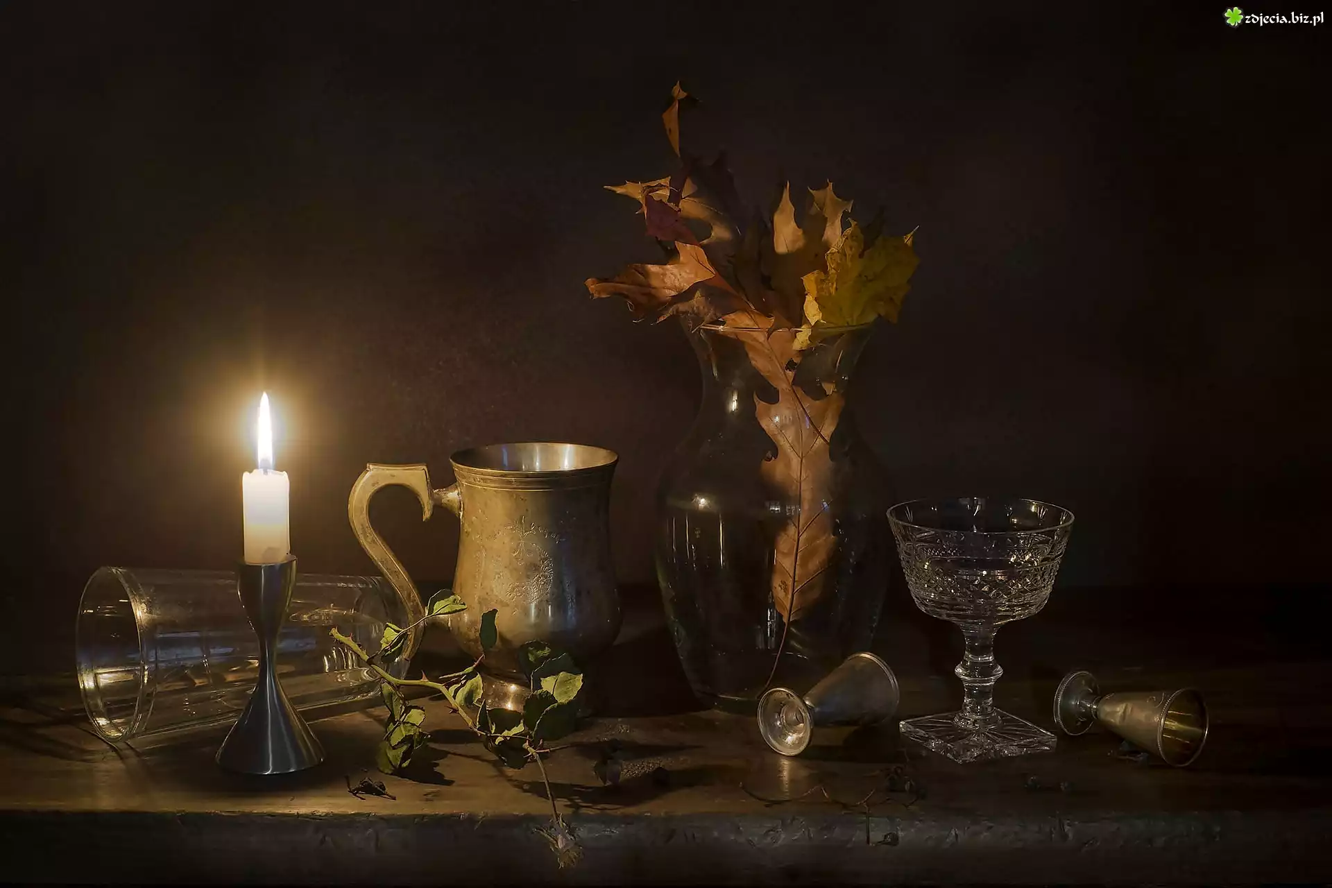 Zdjęcie Kompozycja, Świeca, Kufel, Kieliszek, Liść
