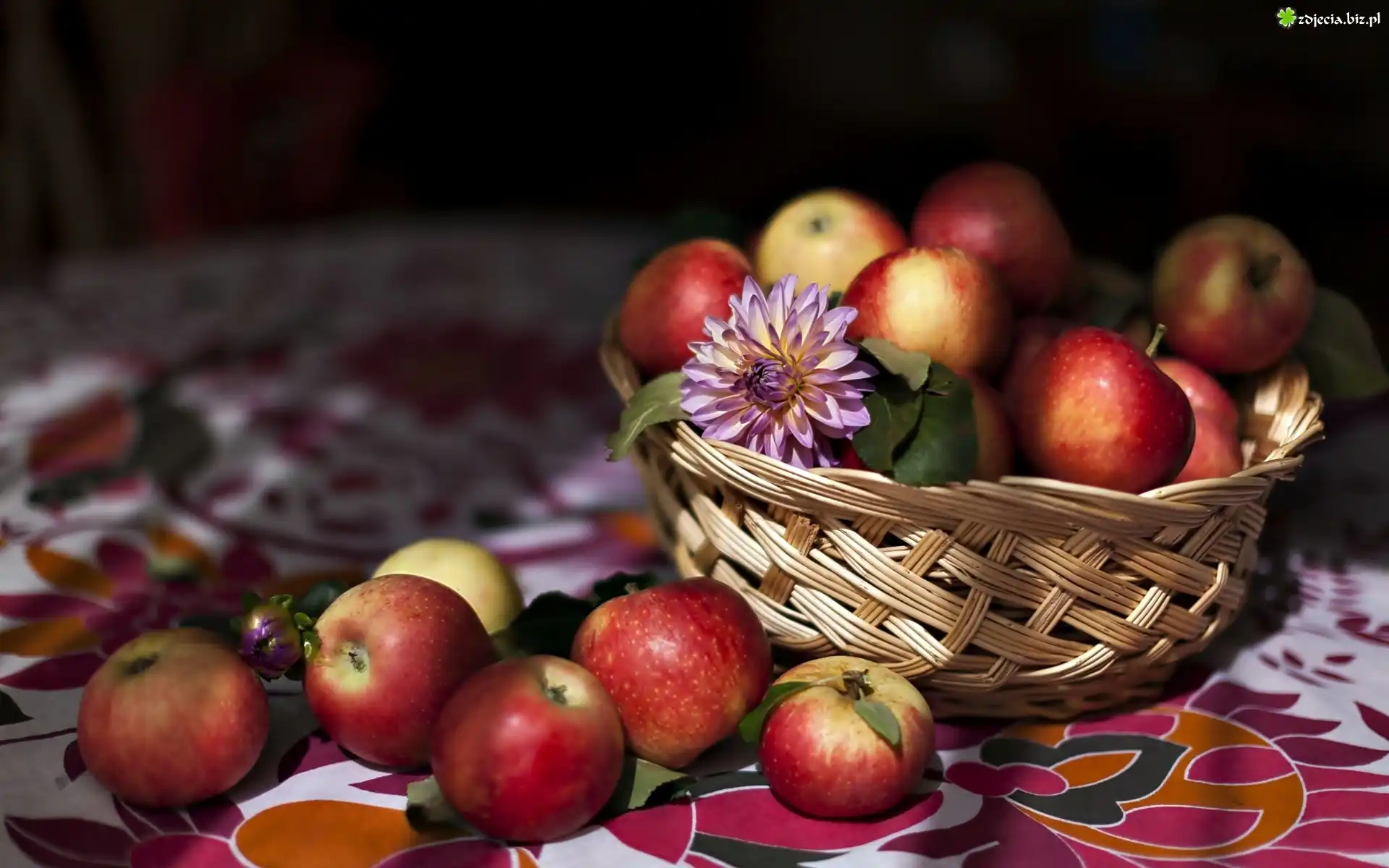 Zdjęcie Kompozycja, Jabłka, Koszyczek, Kwiatek, Kolorowy, Obrus