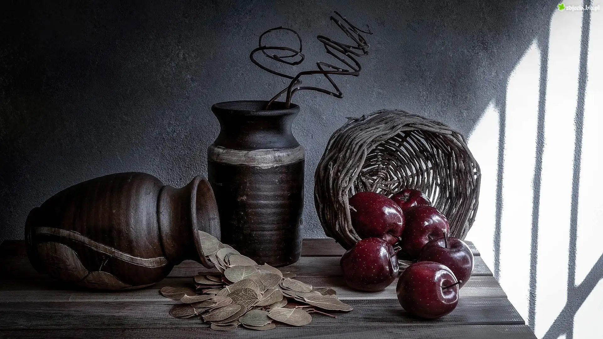 Zdjęcie Kompozycja, Wazony, Kosz, Jabłka