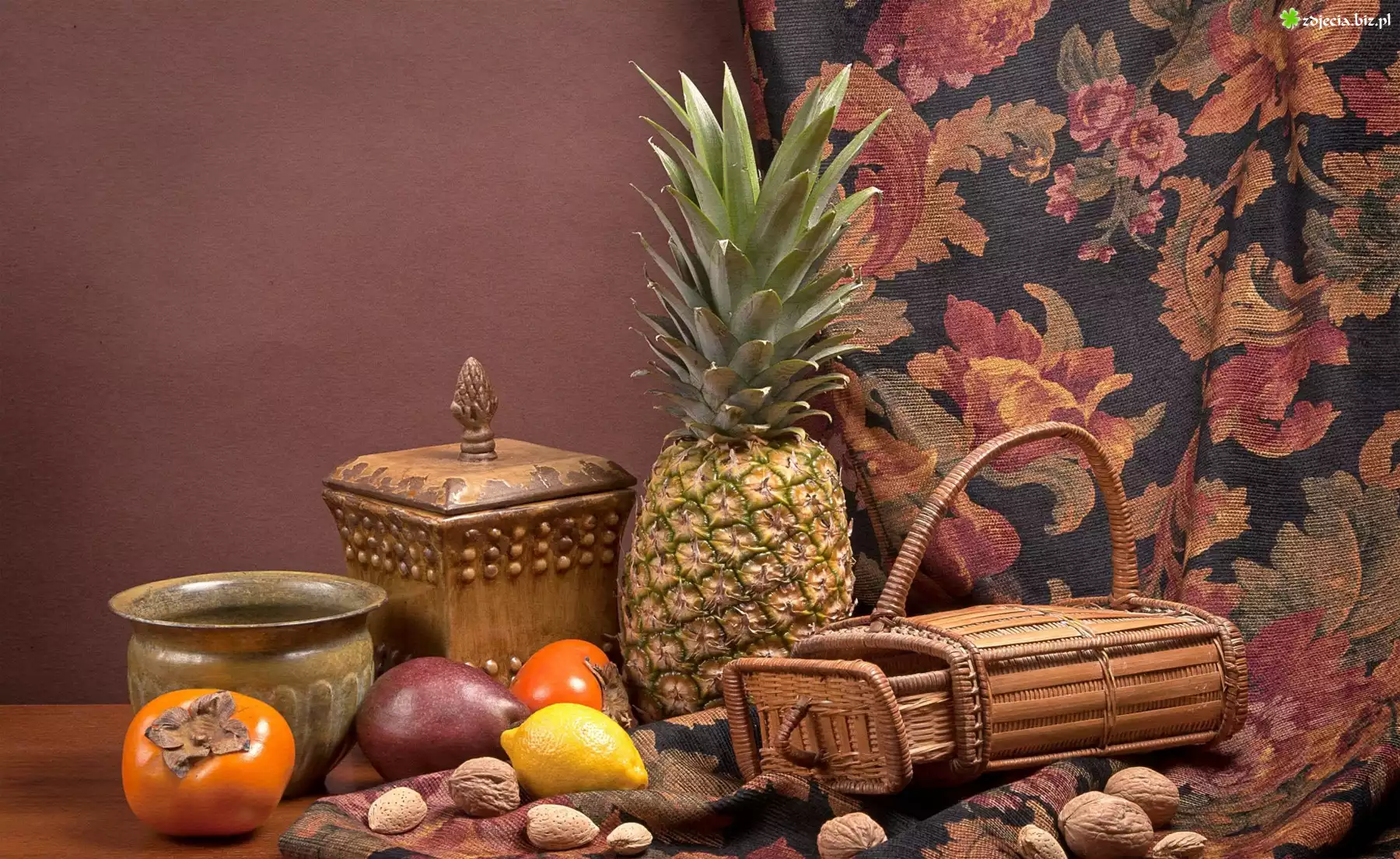 Zdjęcie Kompozycja, Ananas, Cytryna, Orzechy, Koszyk, Naczynia