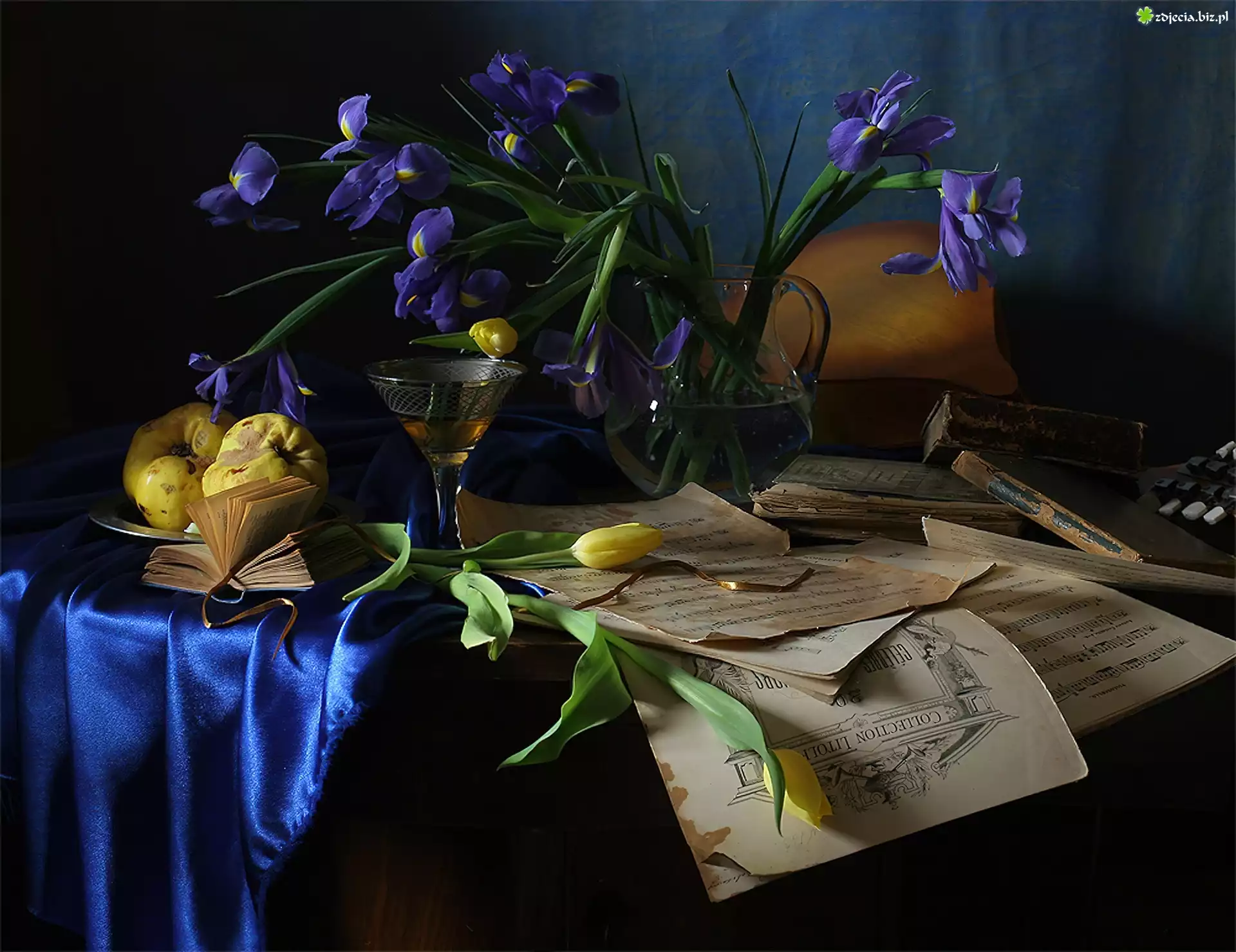 Zdjęcie Kompozycja, Irysy, Tulipany, Lampka, Wina