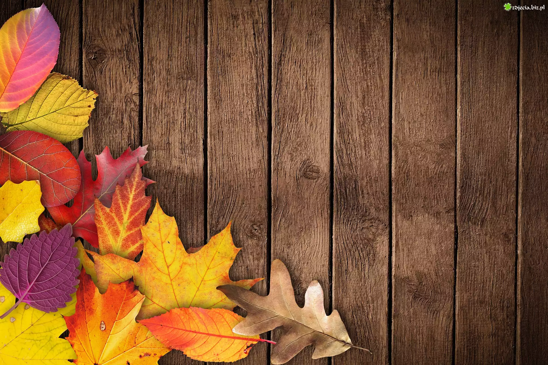 Zdjęcie Kompozycja, Kolorowe, Jesienne, Liście, Deski