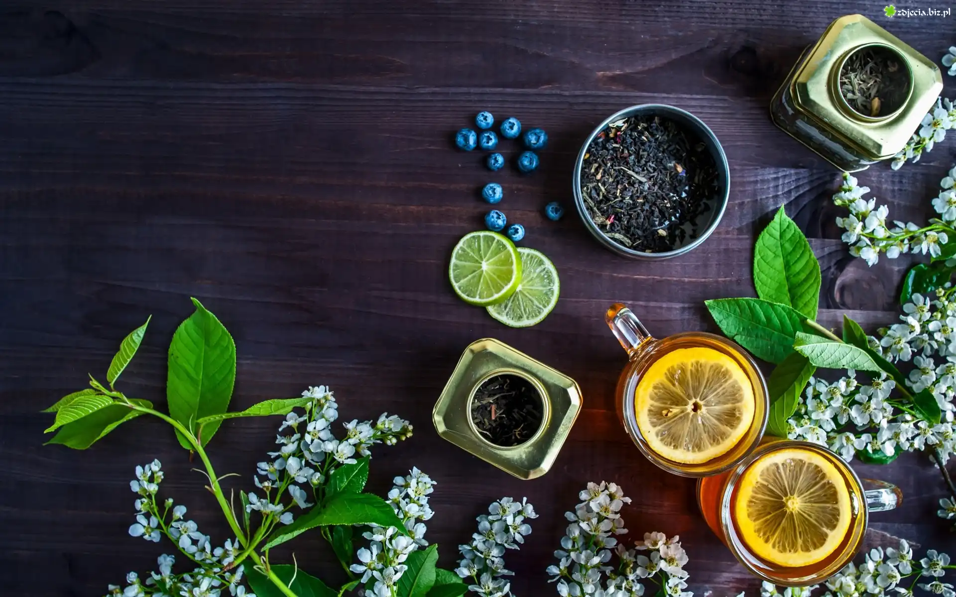Zdjęcie Kompozycja, Borówki, Herbata, Cytryna, Napój, Jagody