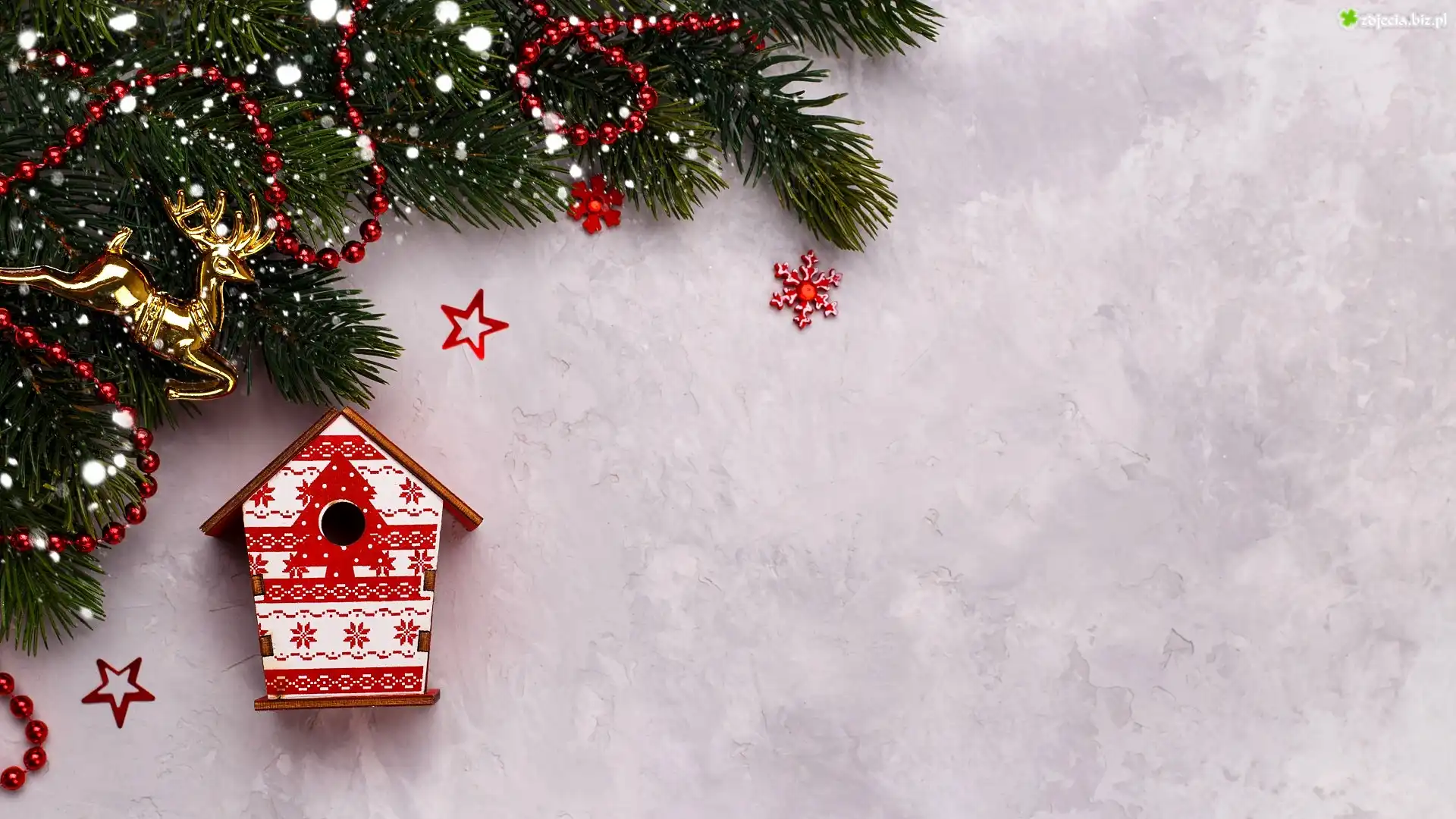 Zdjęcie Świąteczna, Kompozycja, Boże Narodzenie, Gałązki, Ozdoby, Renifer, Koraliki, Zawieszka, Karmnik |