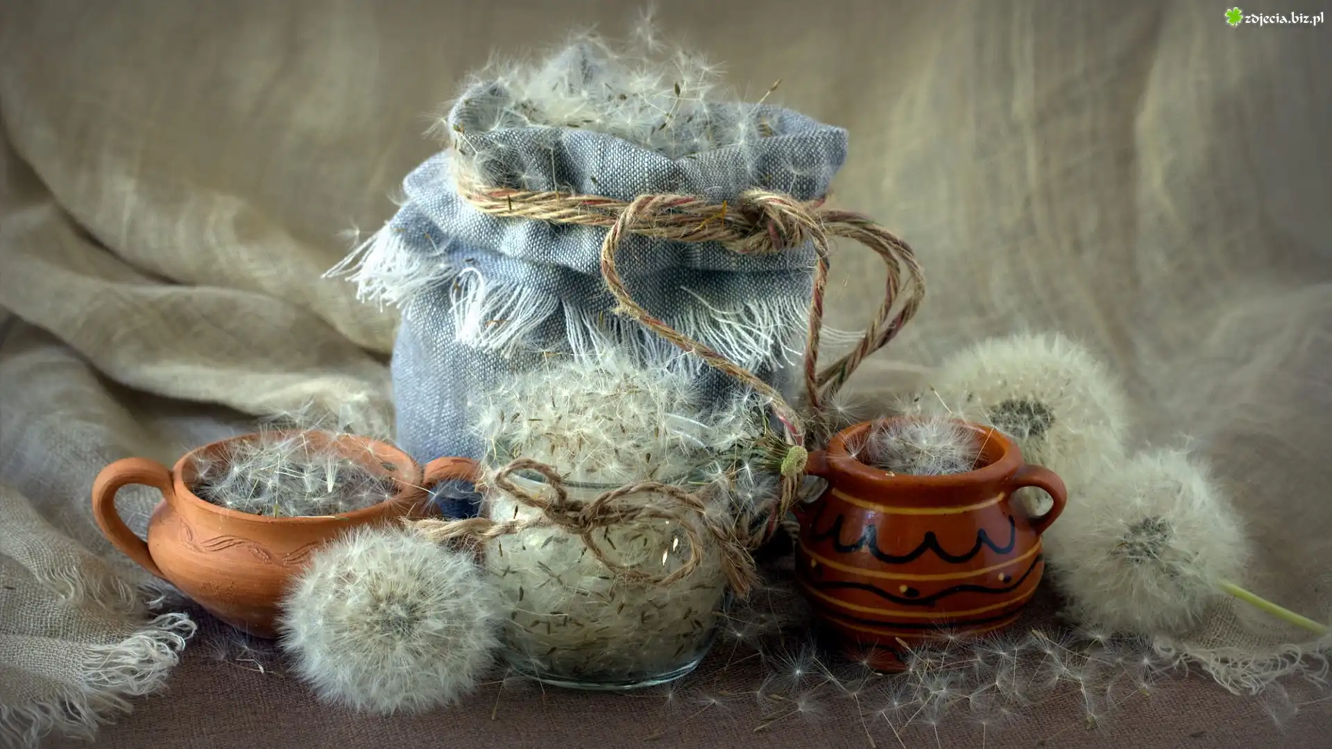 Zdjęcie Kompozycja, Gliniane, Naczynia, Słoik, Niełupki, Dmuchawce