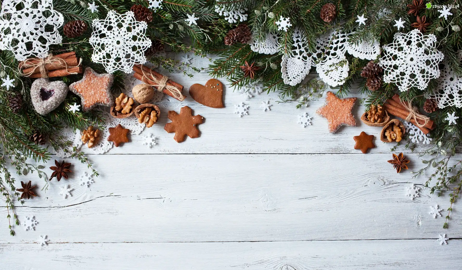 Zdjęcie Kompozycja, Boże Narodzenie, Gałązki, Świerka, Serwetki, Handmade, Rękodzieło, Szydełko, Śnieżynki, Ciasteczka, Pierniczki, Laski, Cynamonu, Orzechy włoskie, Anyż |