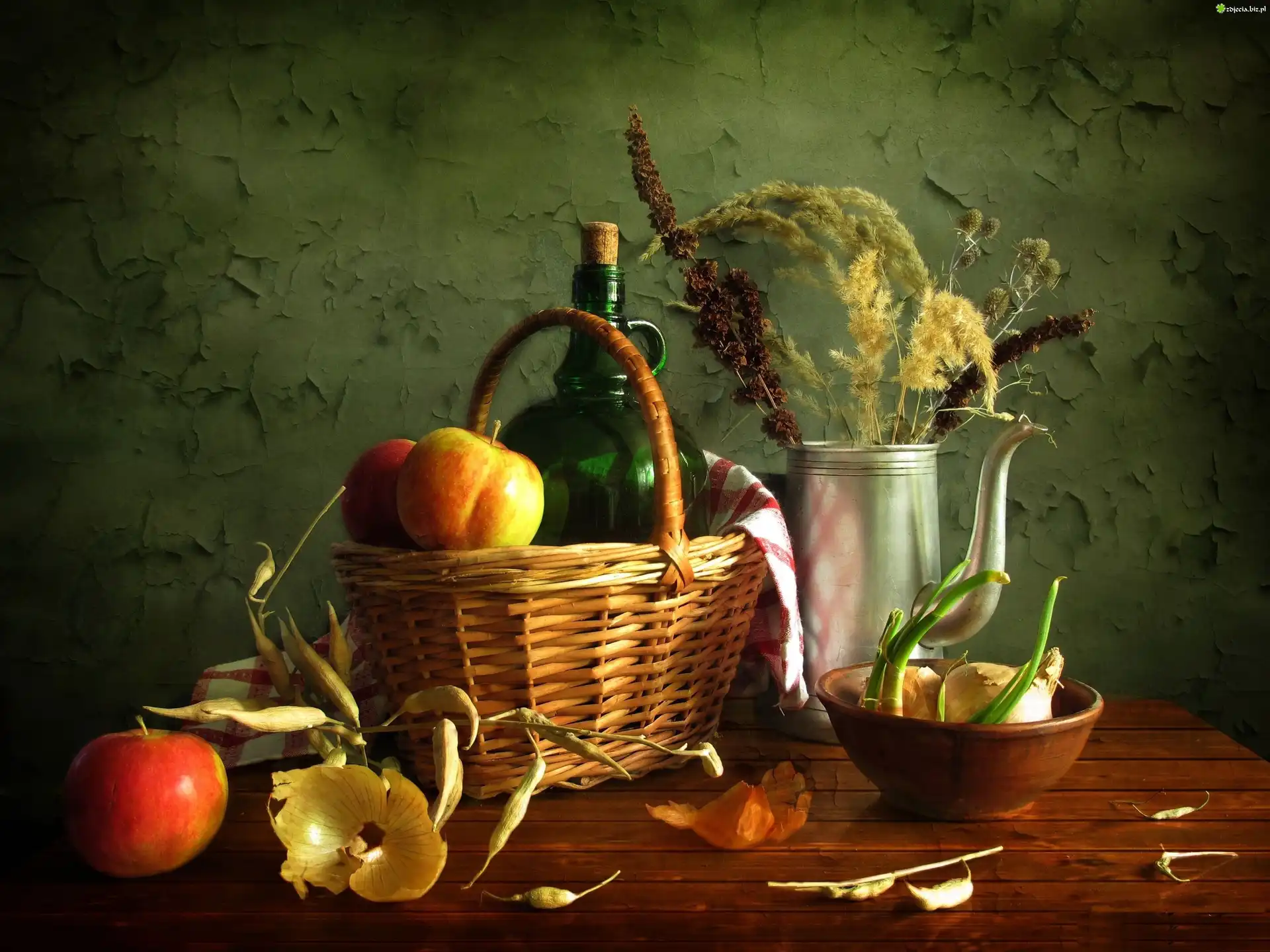 Zdjęcie Kompozycja, Kosz, Jabłka, Cebula, Butelka