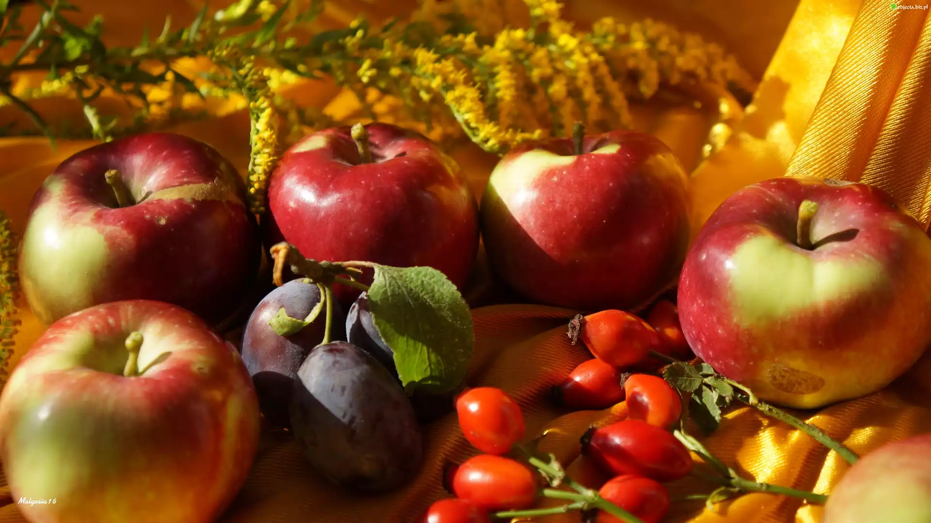 Zdjęcie Kompozycja, Owoce, Jabłka, Dzika Róża, Śliwka