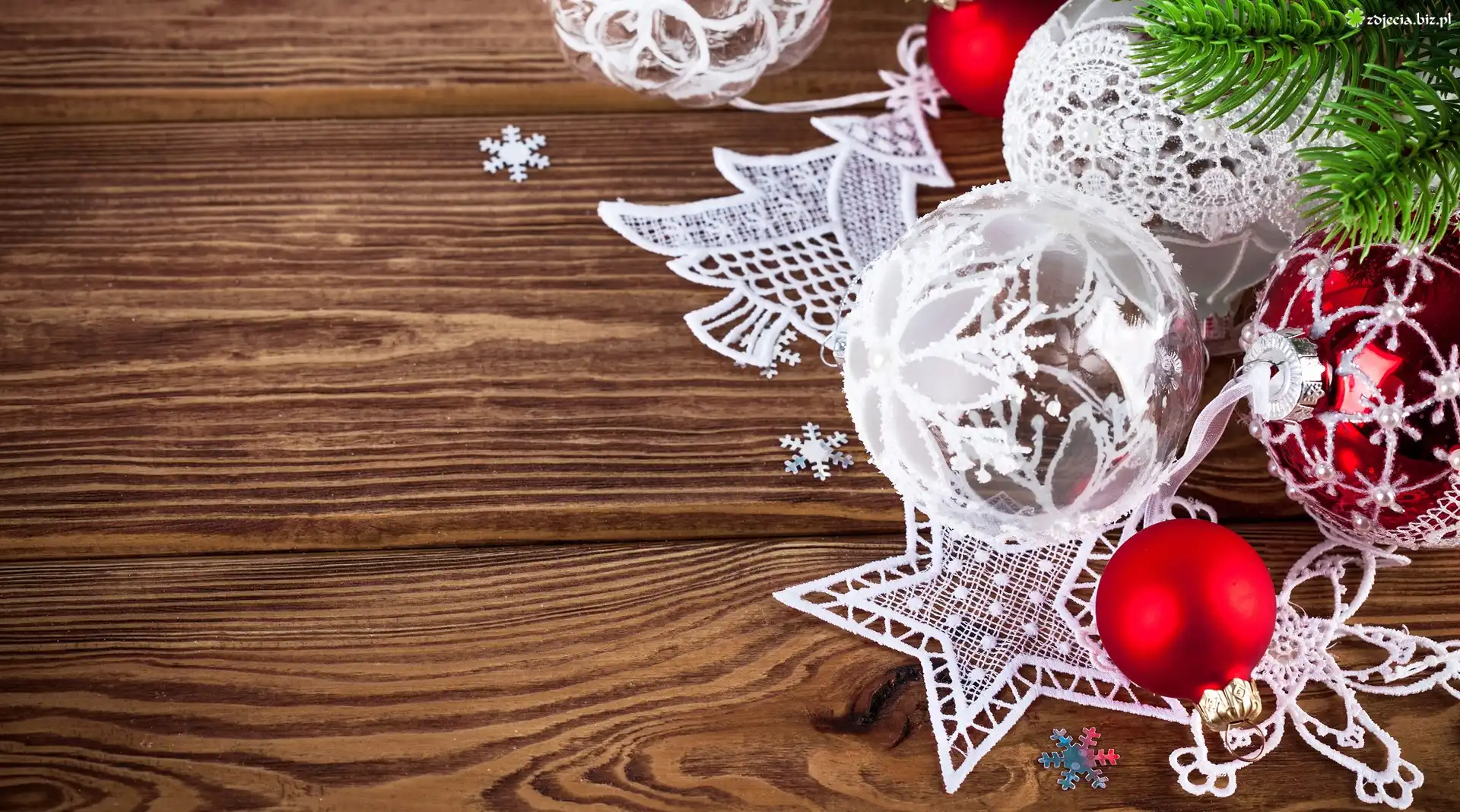Zdjęcie Kompozycja, Świąteczna, Bombki, Gałązki, Serwetki, Deski