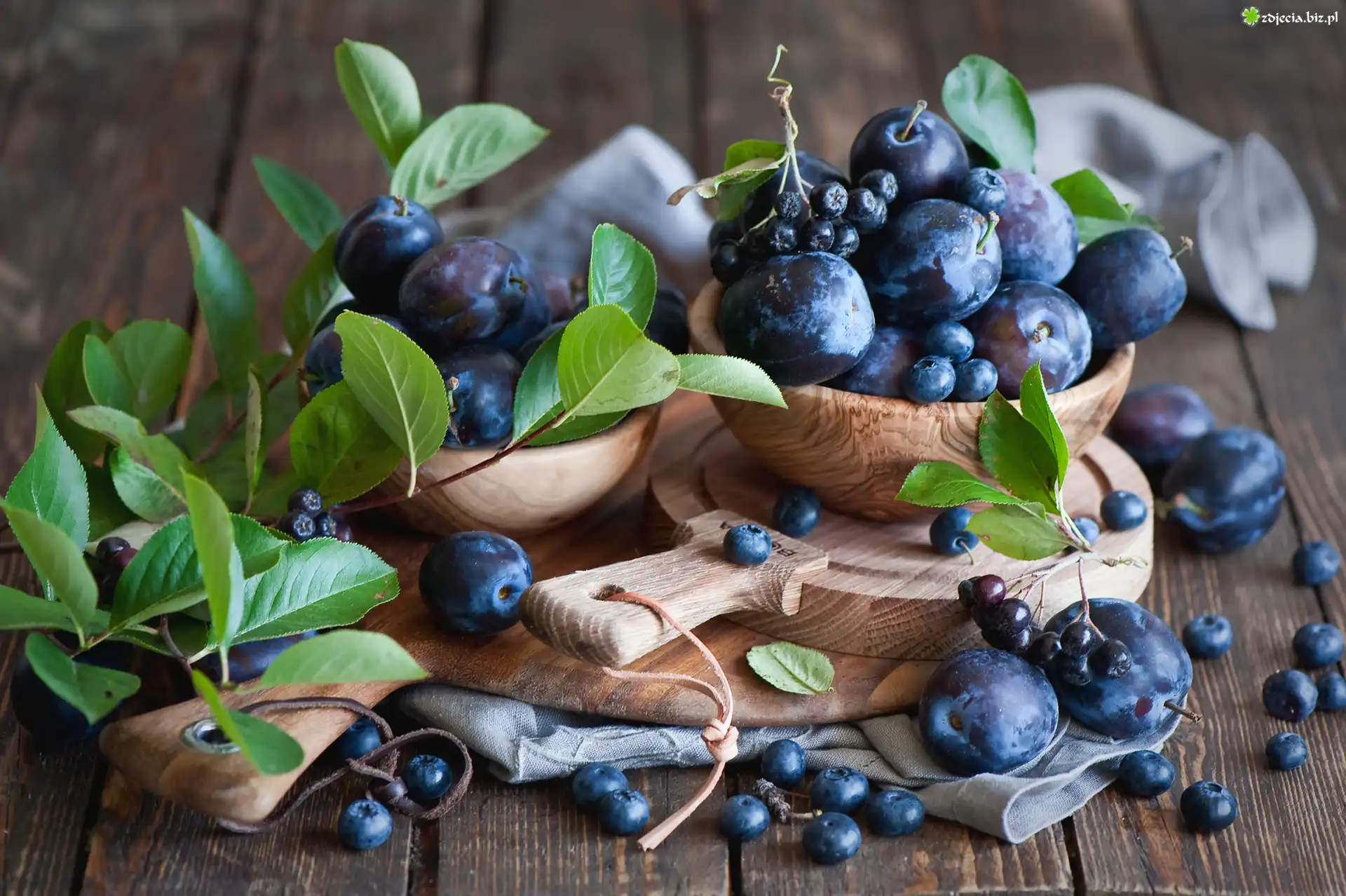 Zdjęcie Kompozycje, Śliwka, Aronia, Borówki, Miseczki, Deska