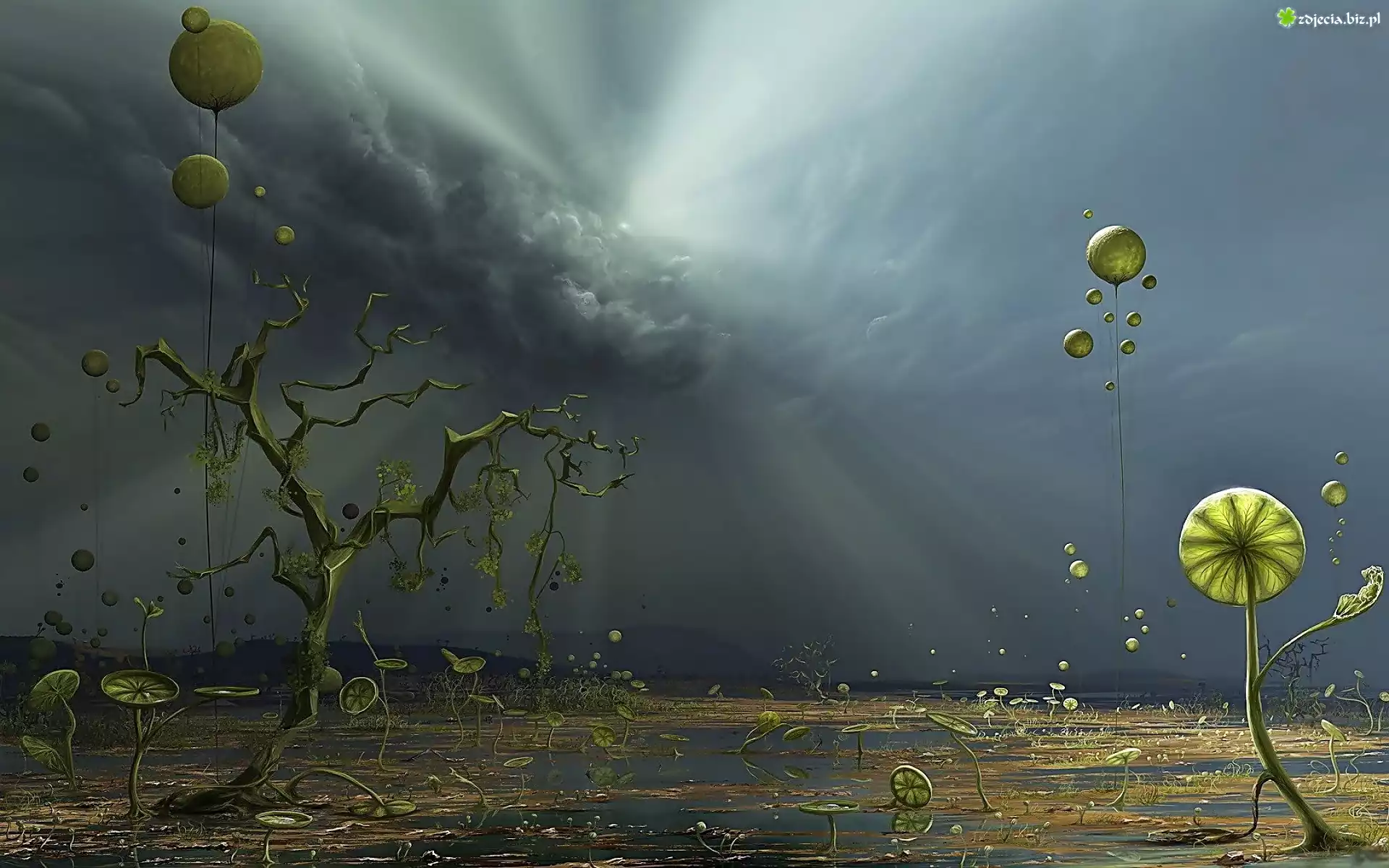 Zdjęcie Grafika komputerowa, Fantasy, Drzewa, Rośliny, Chmury, Promienie słońca