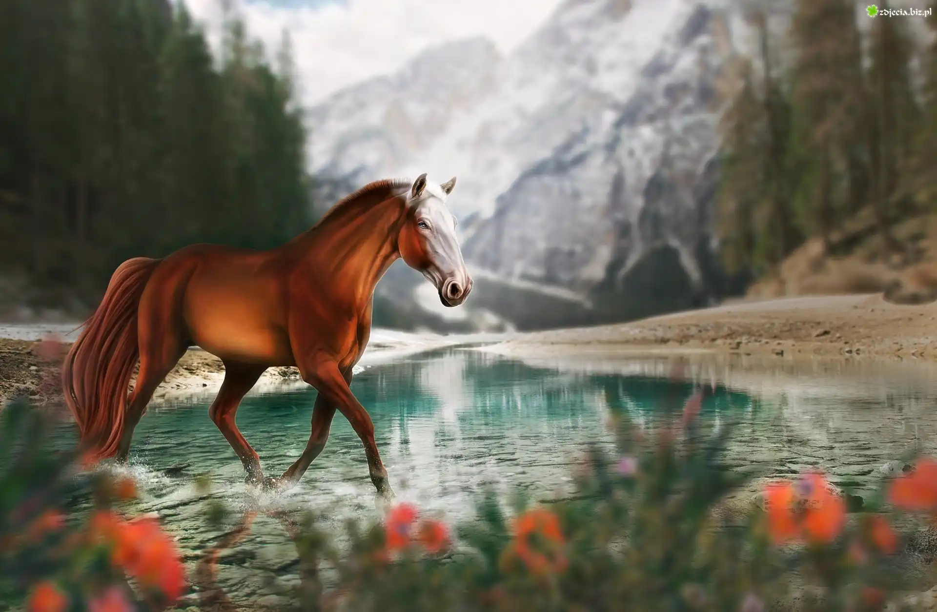 Zdjęcie Koń, Rzeka, Góry, Grafika 2D