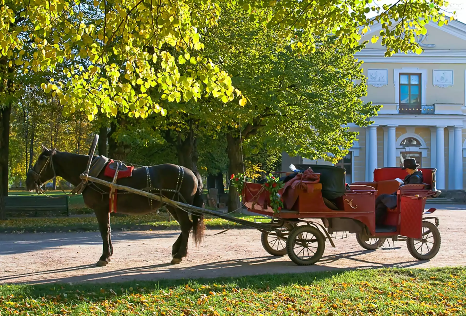 Zdjęcie Koń, Bryczka, Kobieta, Dworek