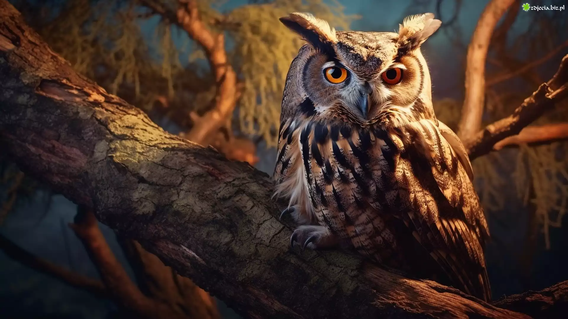 Zdjęcie Sowa, Puchacz, Drzewo, Konar, Noc, Blask