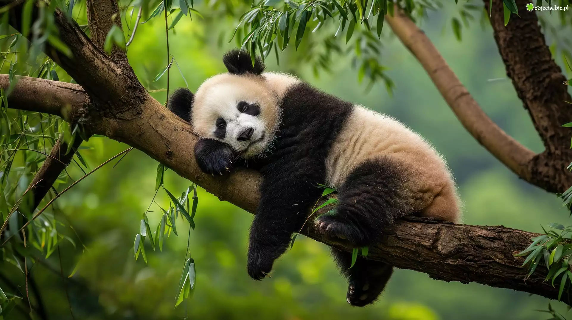 Zdjęcie Śpiąca, Panda, Drzewo, Konar, Liście, Grafika