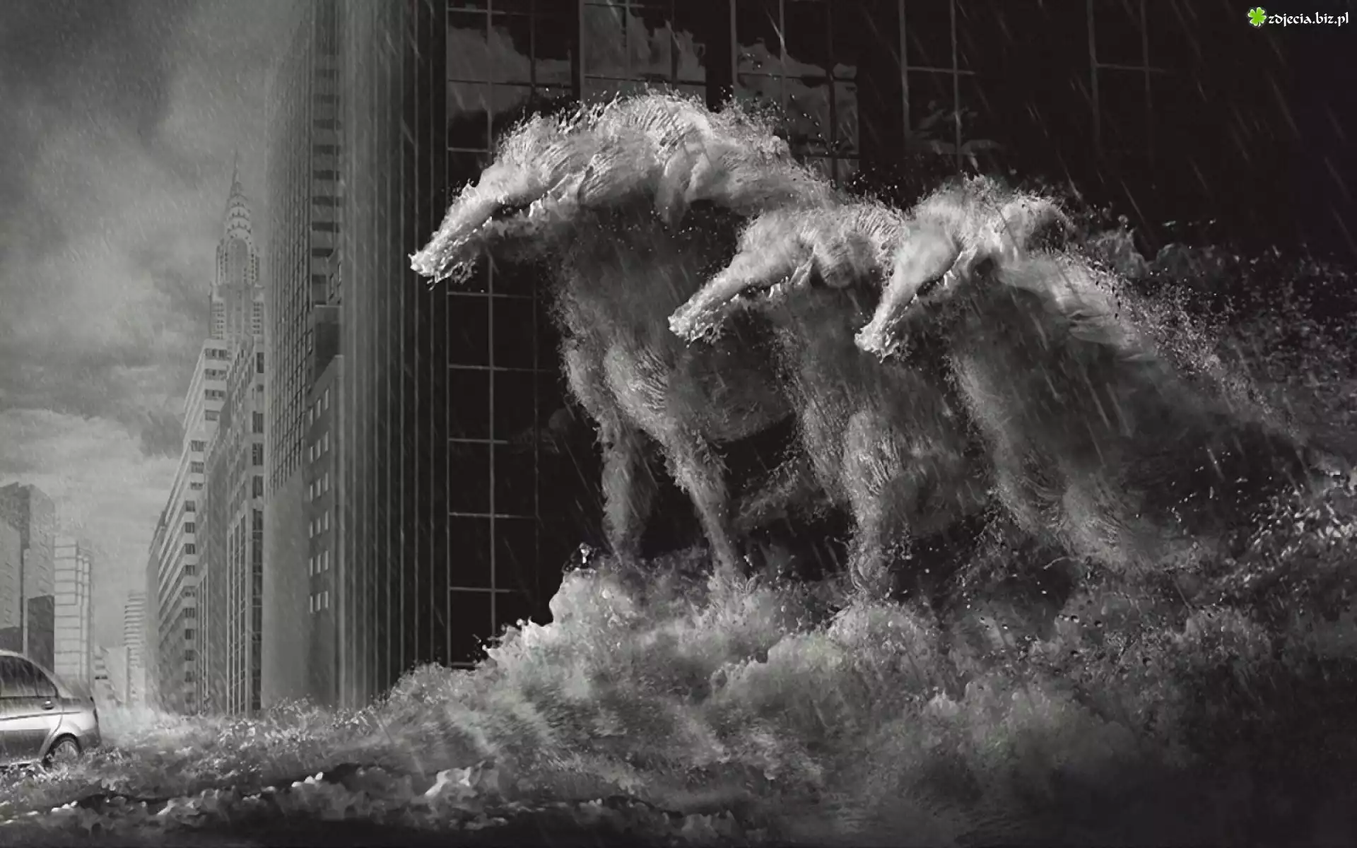 Zdjęcie Konie, Deszcz, Fala, Budynki
