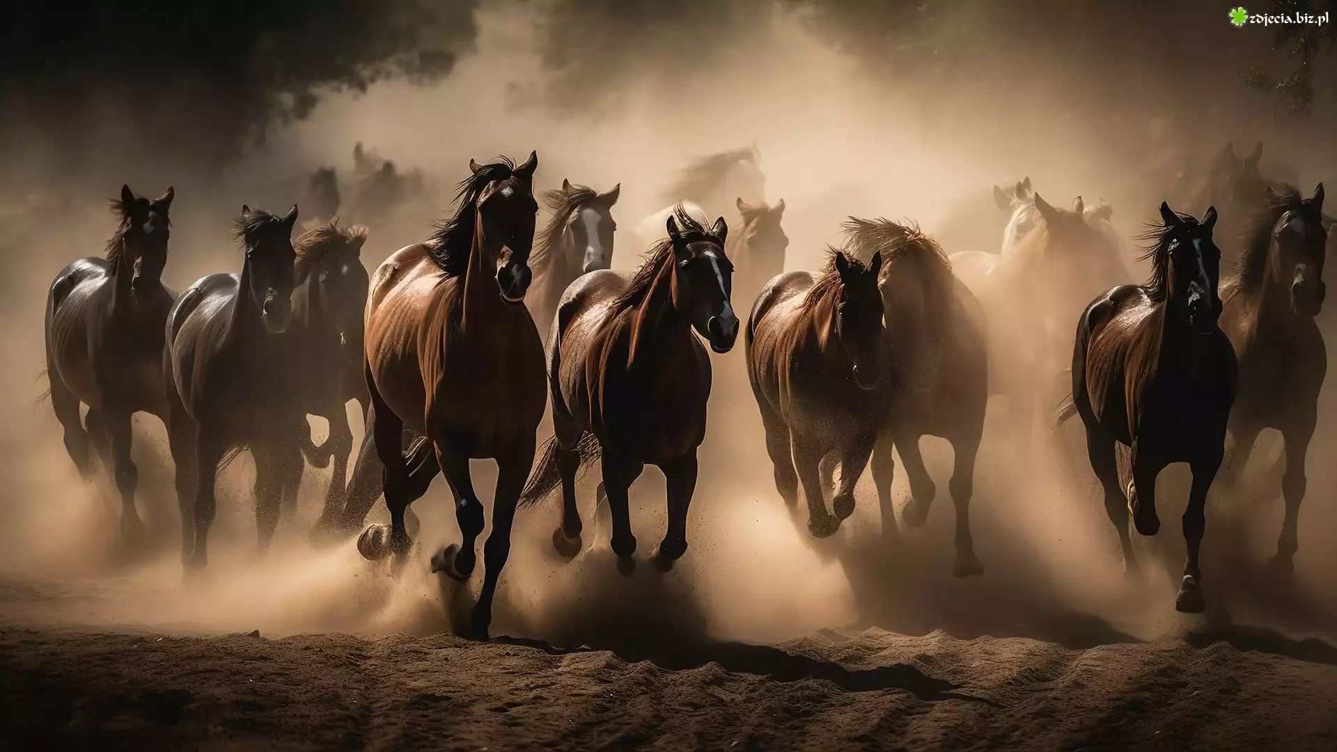 Zdjęcie Stado, Konie, Galop, Piasek, Kurz