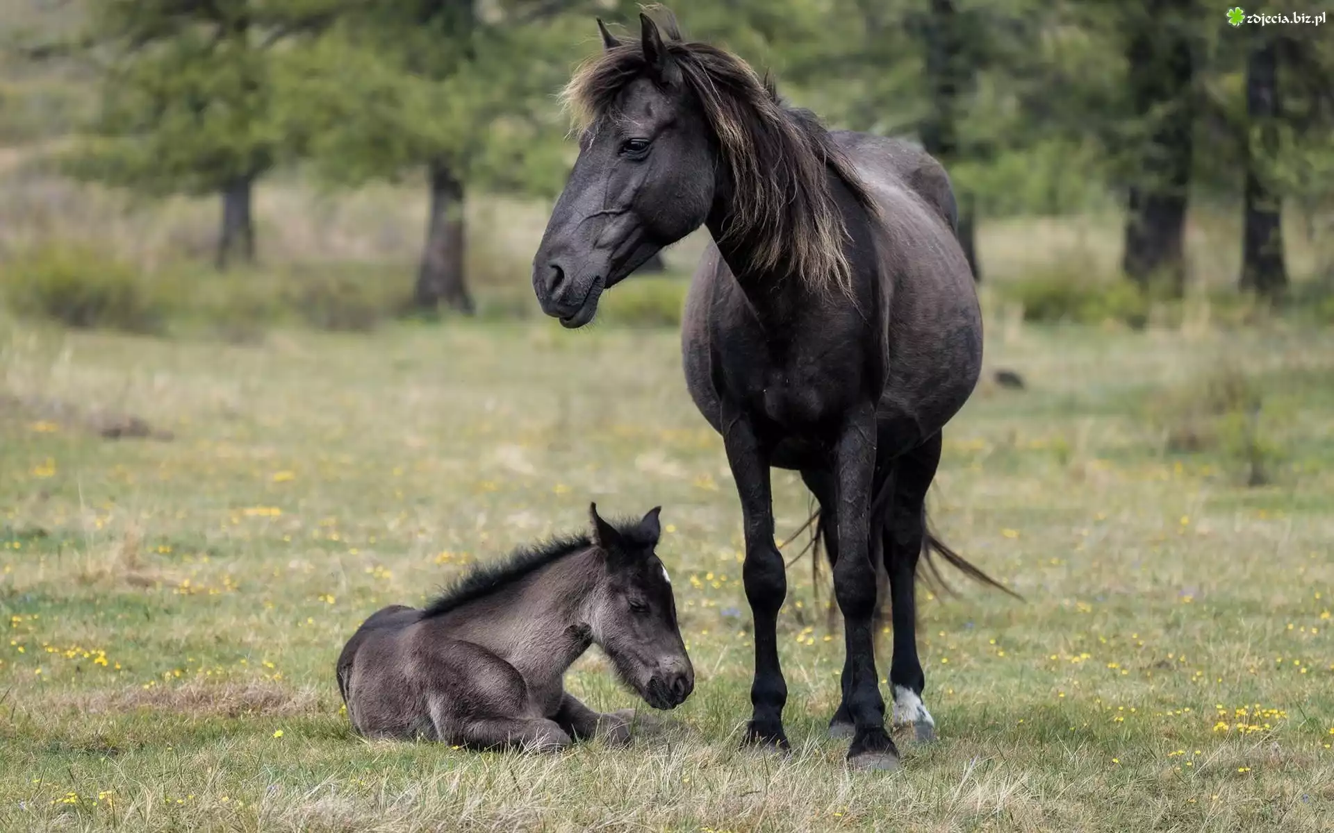 Zdjęcie Konie, Czarny, Koń, Źrebak, Łąka