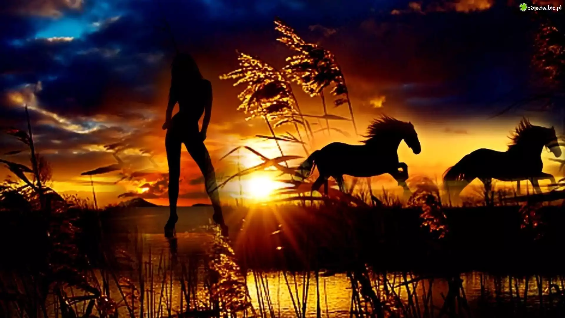 Zdjęcie Konie, Zachód, Słońca, Kobieta