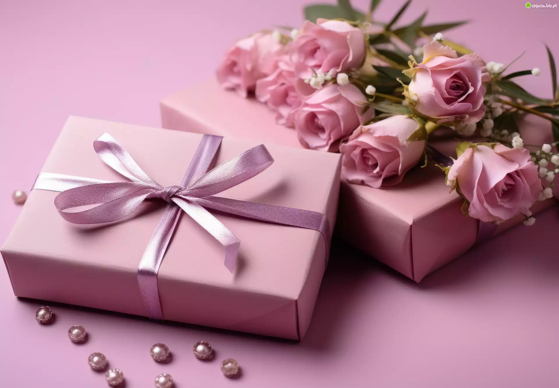 Zdjęcie Dwa, Pudełka, Prezenty, Koraliki, Kwiaty, Różowe, Róże