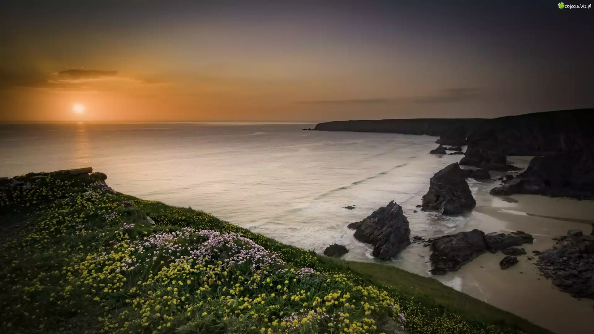 Zdjęcie Anglia, Kornwalia, Morze Celtyckie, Skały, Roślinność, Zachód słońca