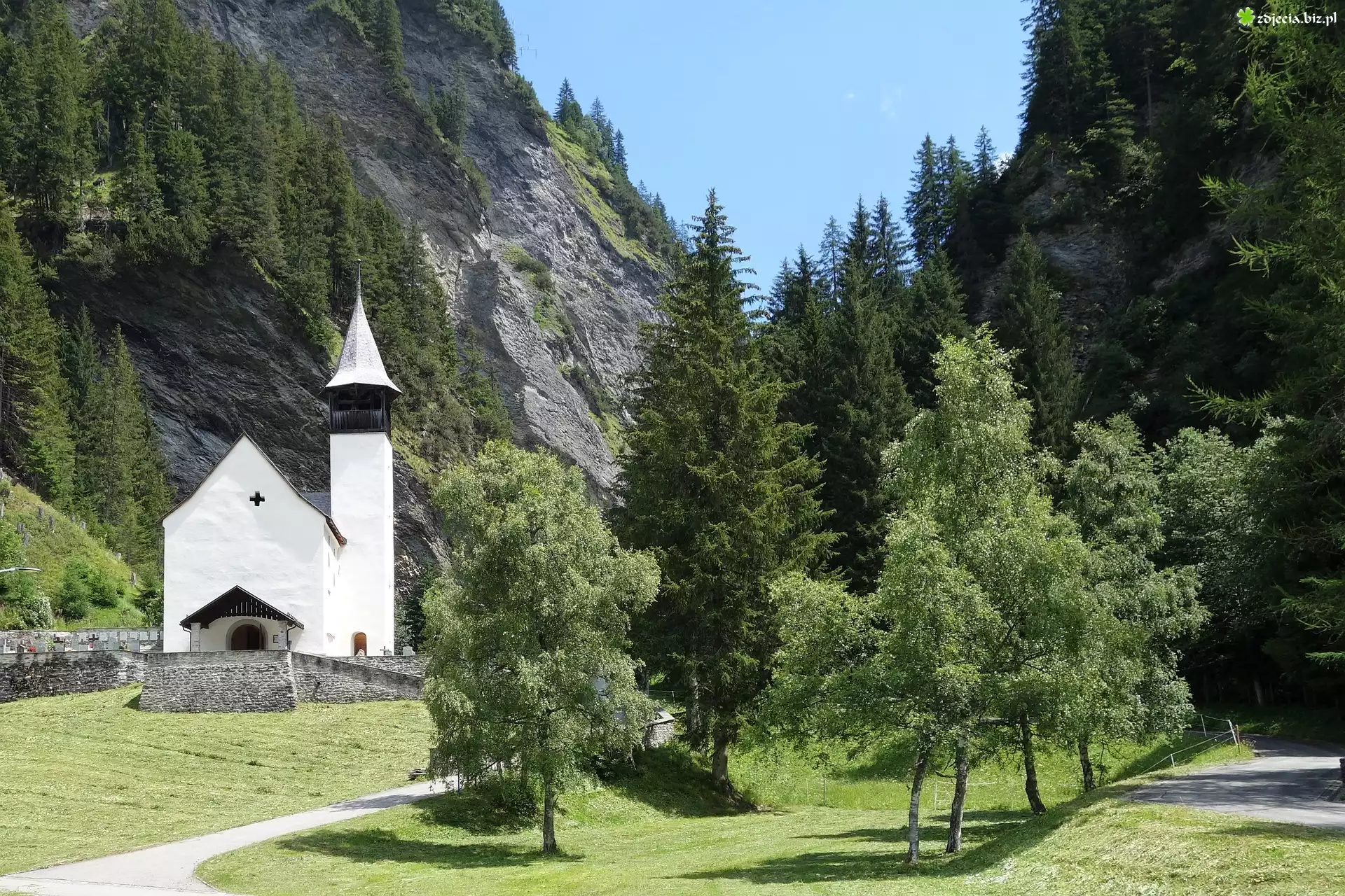 Zdjęcie Kościół, Góry, Skała, Drzewa, Droga