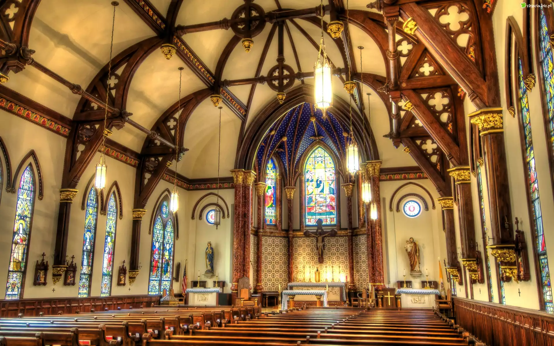 Zdjęcie, Kościół, Ławki, Witraże, Ołtarz, Sklepienie