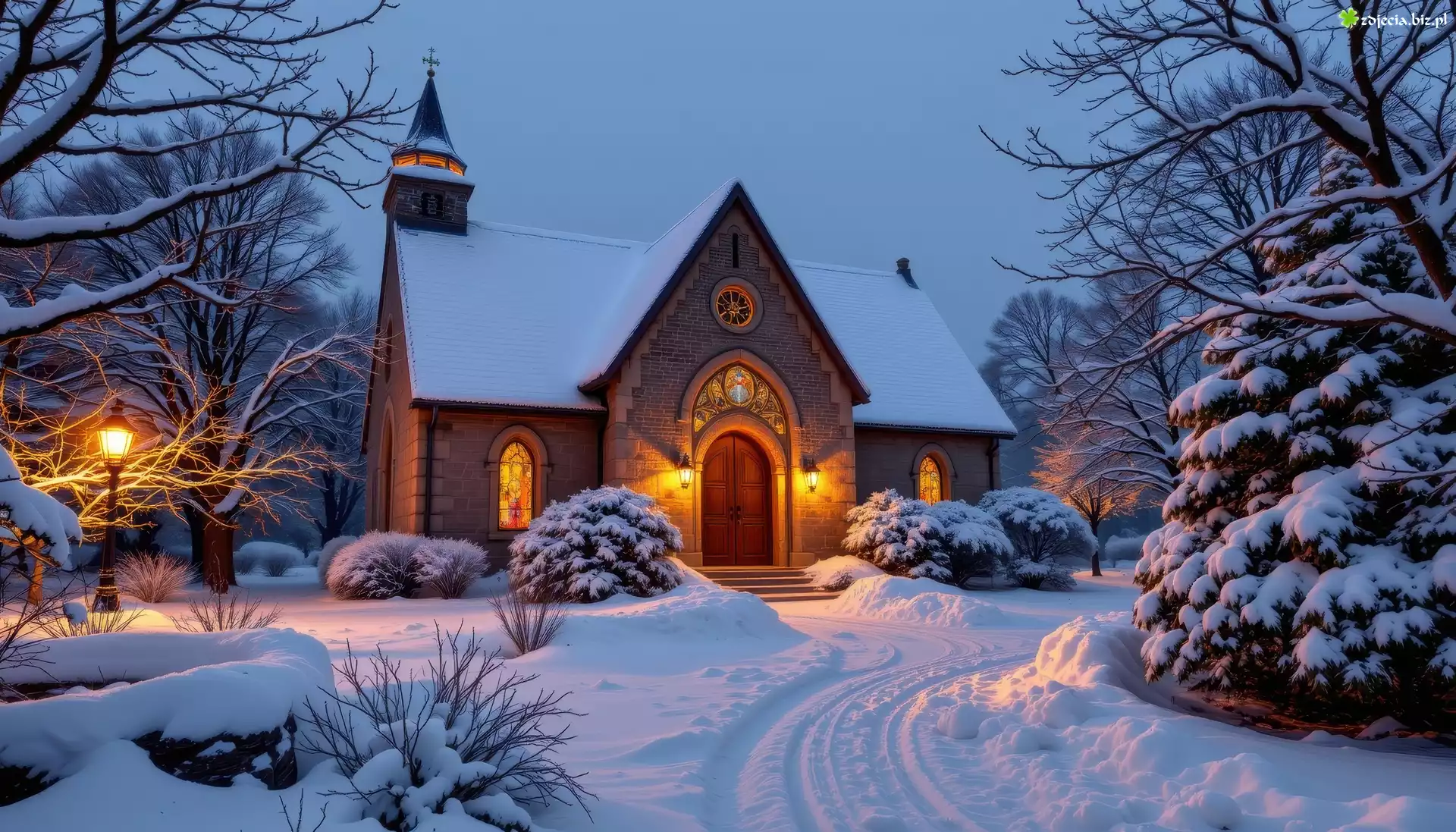 Zdjęcie Zima, Kościół, Ośnieżone, Drzewa, Droga