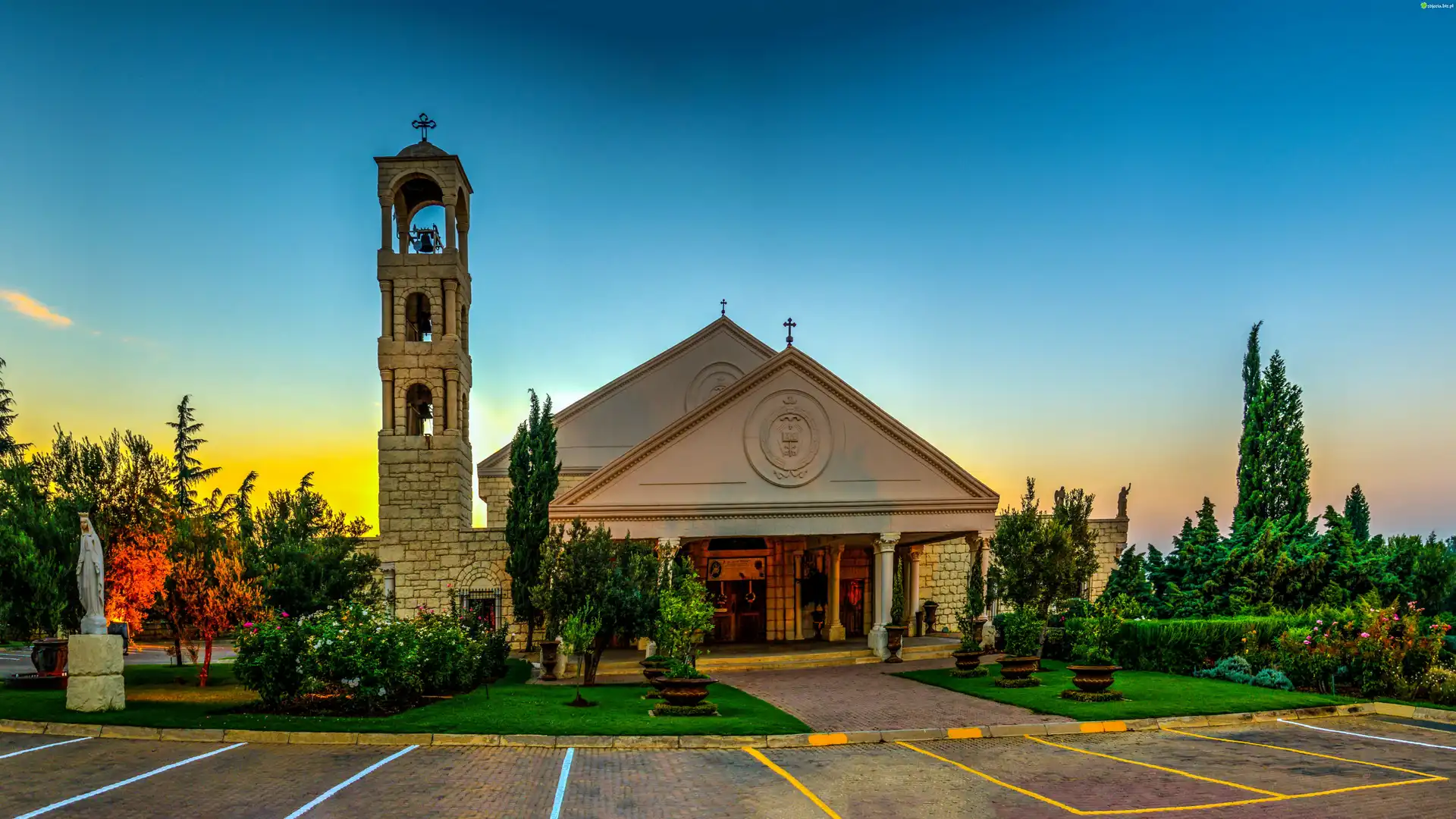 Zdjęcie Kościół, Posąg, Chodnik, Trawa, Drzewa