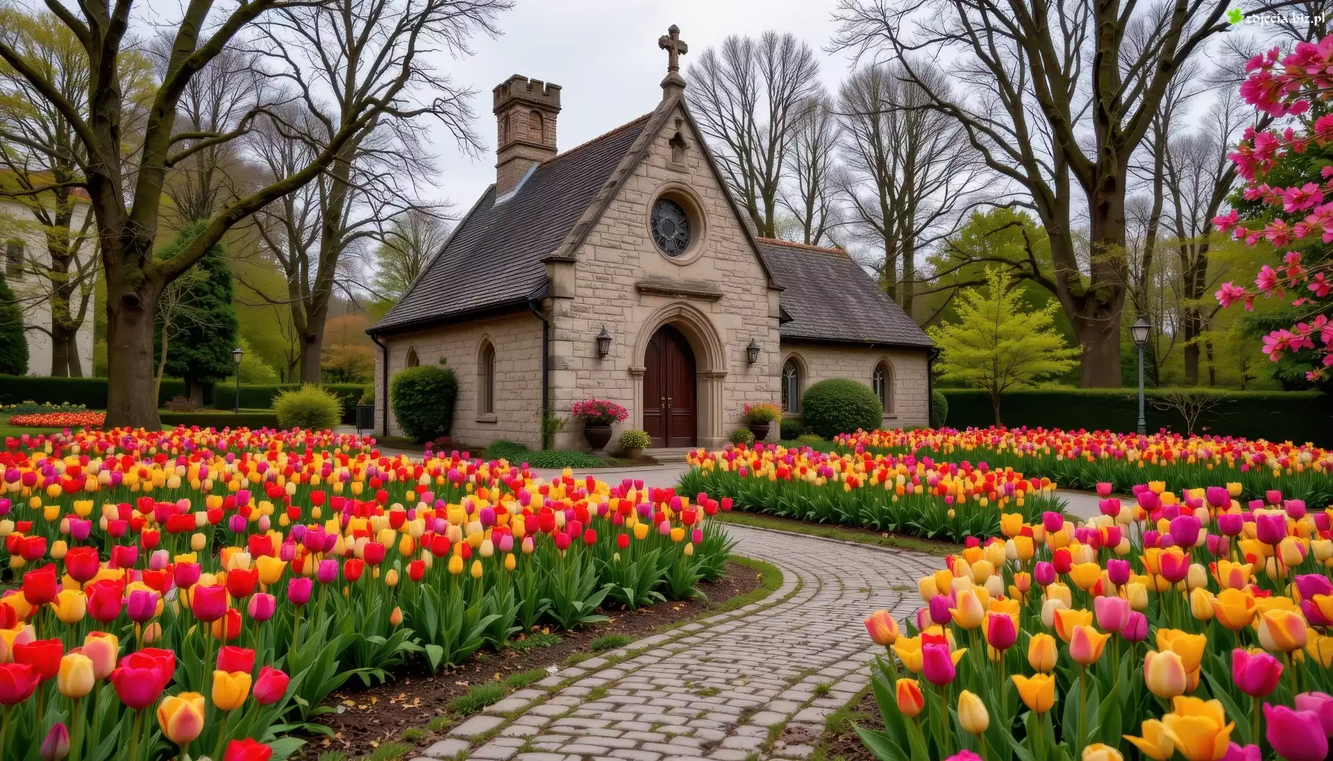 Zdjęcie, Wiosna, Kościół, Tulipany, Ścieżka, Drzewa