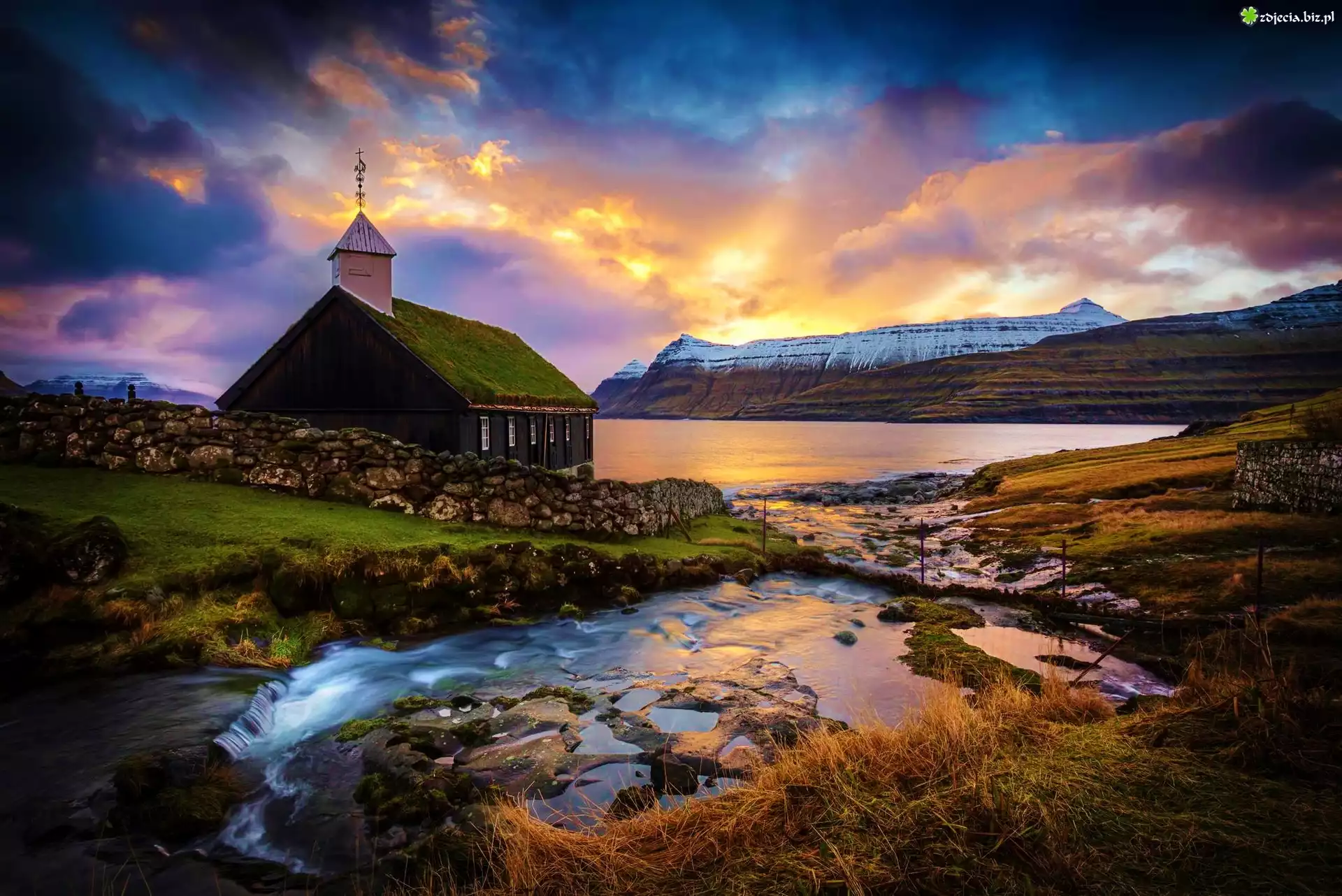 Zdjęcie, Kościółek, Rzeka, Góry, Niebo
