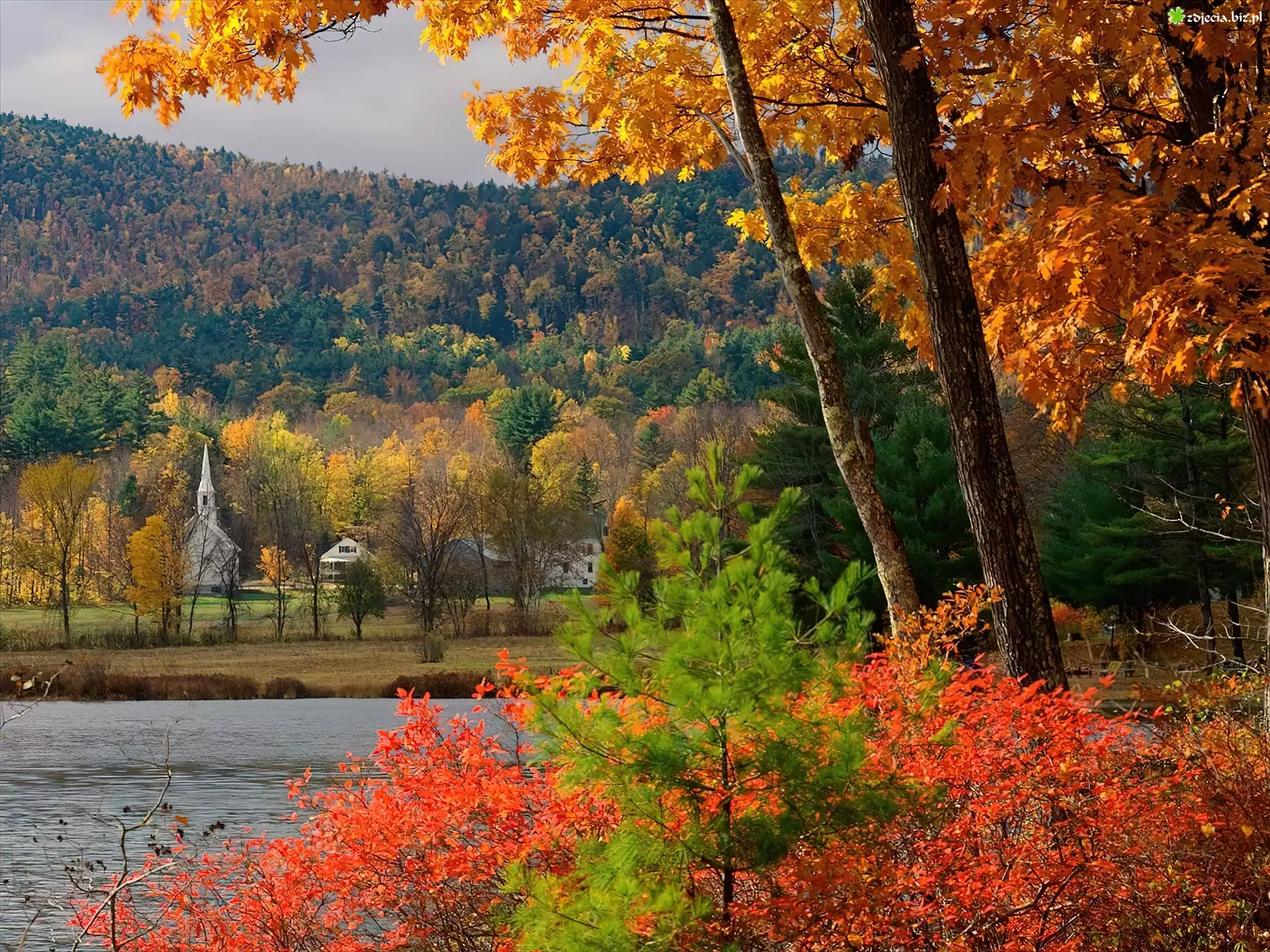 Zdjęcie Kościółek, Rzeka, Kolorowe, Jesienne, Drzewa