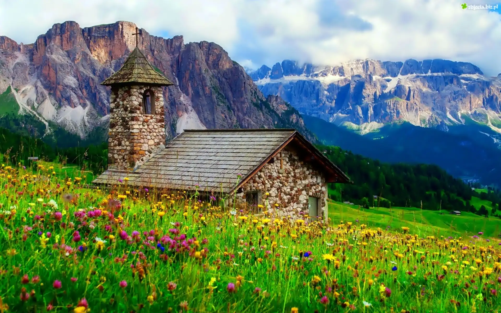 Zdjęcie Kościółek, Łąka, Kwiaty, Góry, Lasy, Alpy