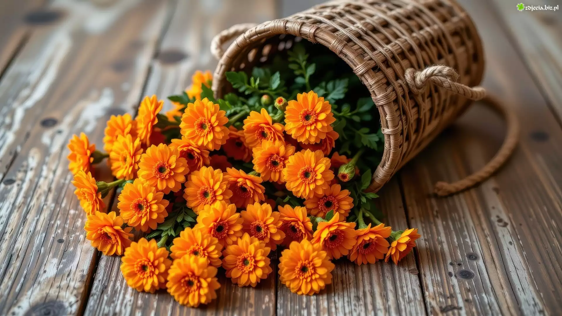 Zdjęcie Pomarańczowe, Kwiaty, Leżący, Kosz, Wiklinowy, Deski