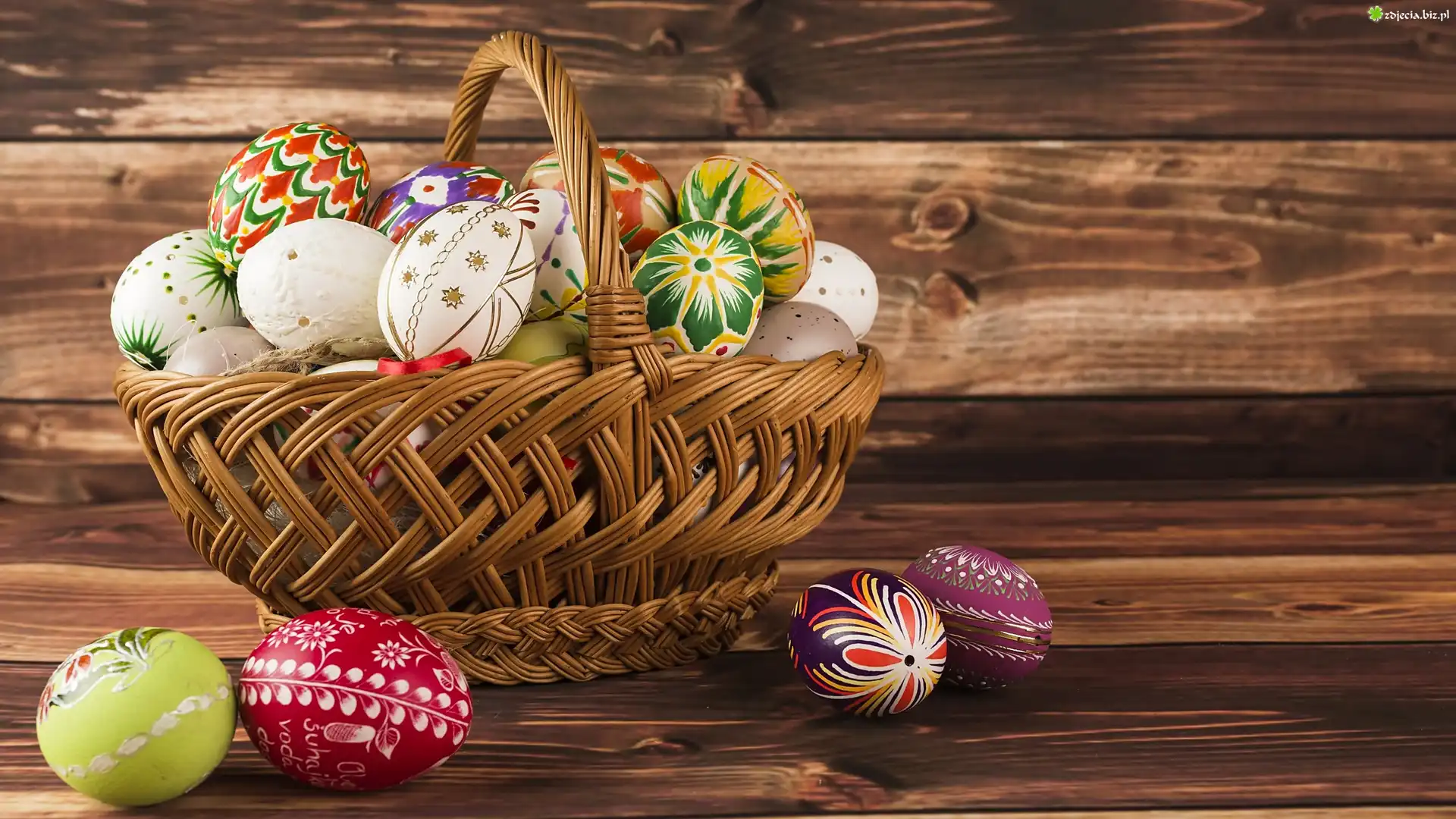 Zdjęcie Kosz, Wiklinowy, Pisanki, Dekoracja, Deski, Wielkanoc