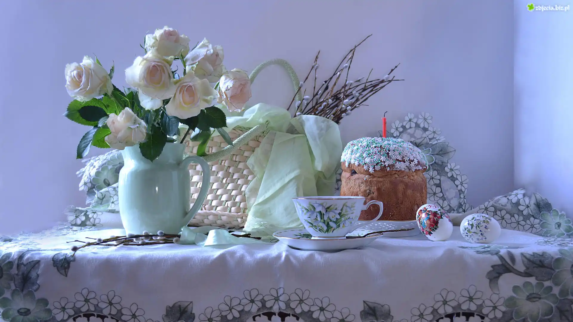 Zdjęcie Wielkanoc, Kosz, Bazie, Pisanki, Róże, Dzbanek, Babka, Filiżanka
