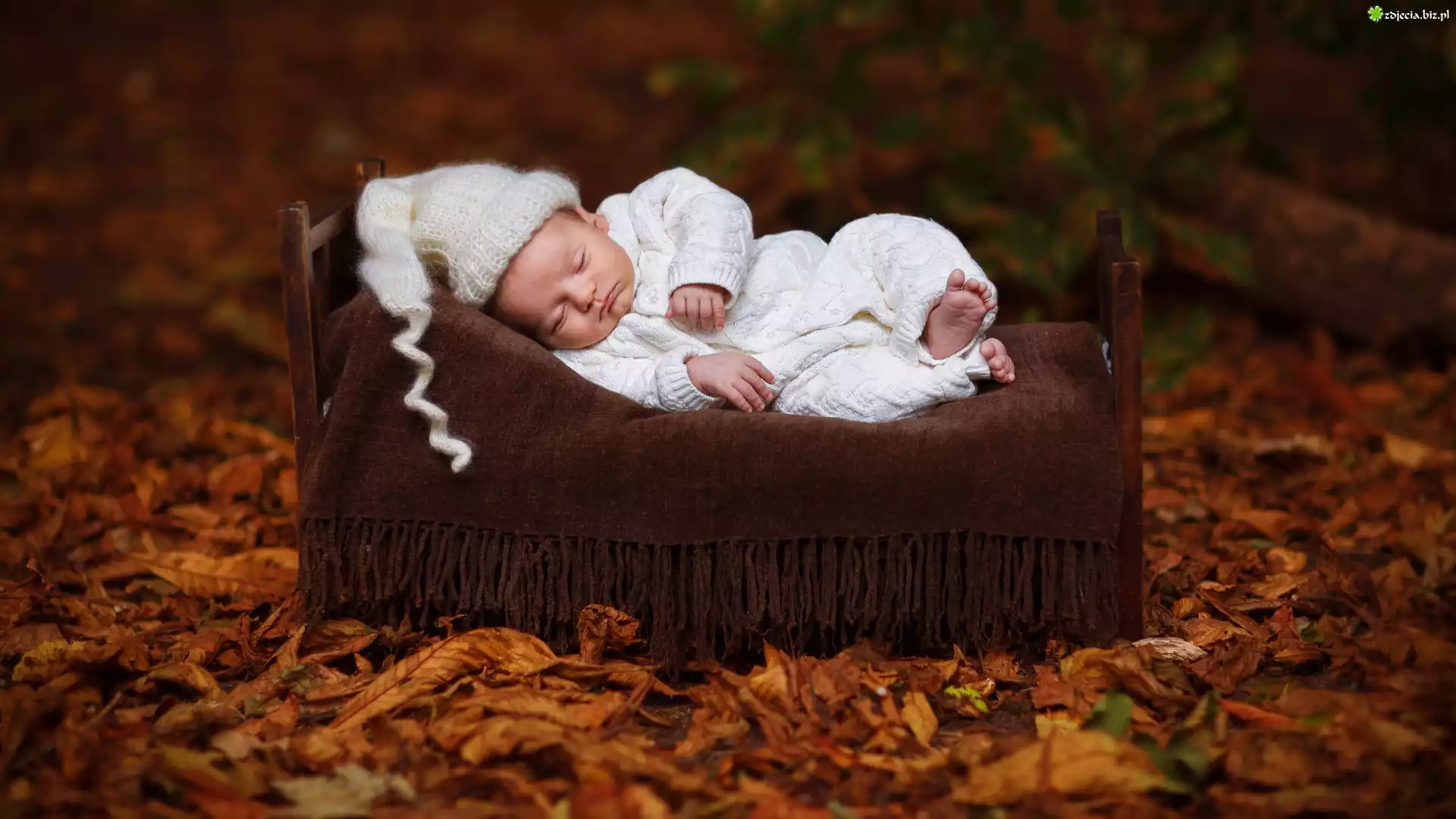 Zdjęcie Śpiące, Niemowlę, Czapeczka, Ubranko, Dzianina, Kosz, Liście