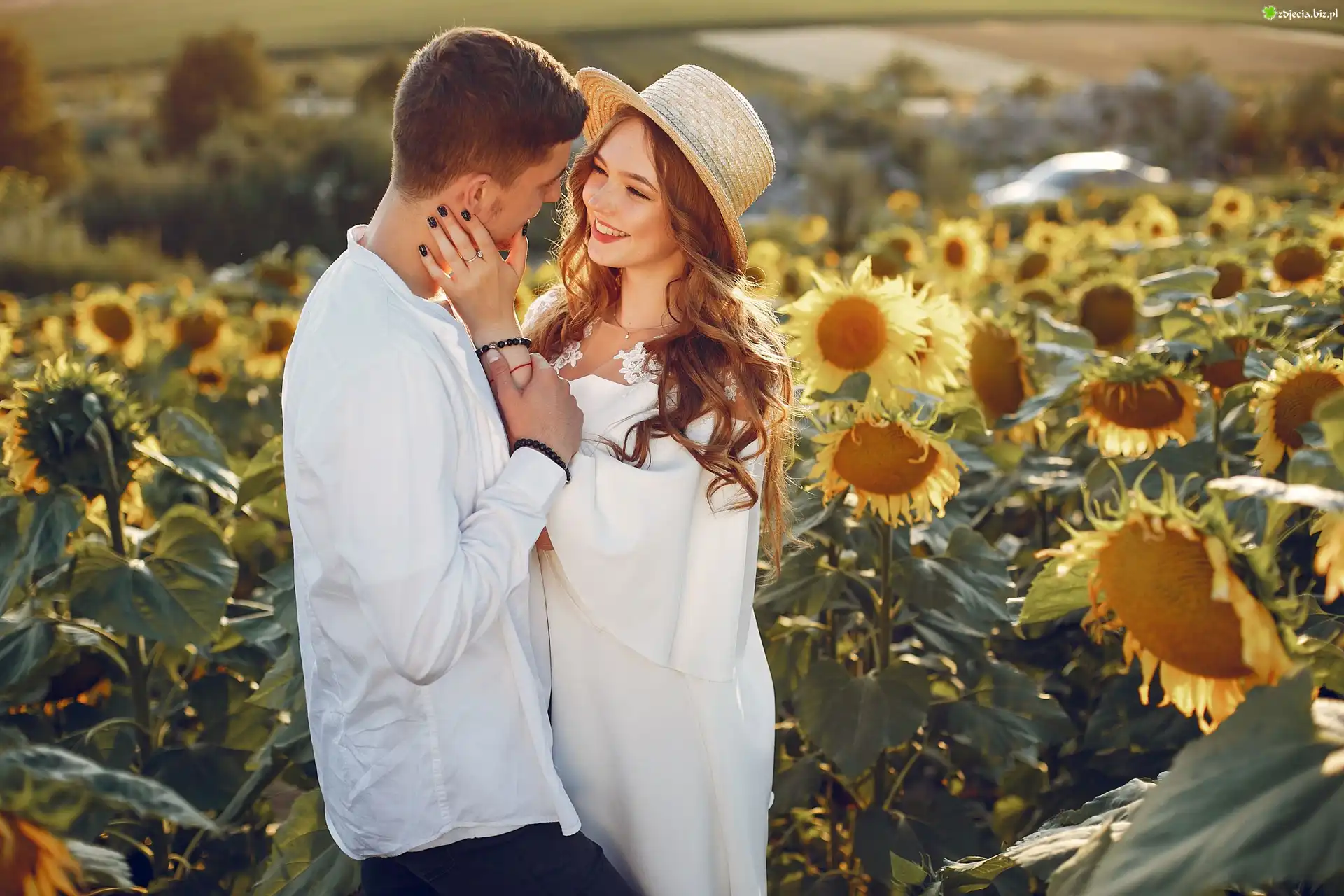 Zdjęcie Pole, Słoneczników, Para, Kobieta, Kapelusz, Biała, Sukienka, Mężczyzna, Koszula
