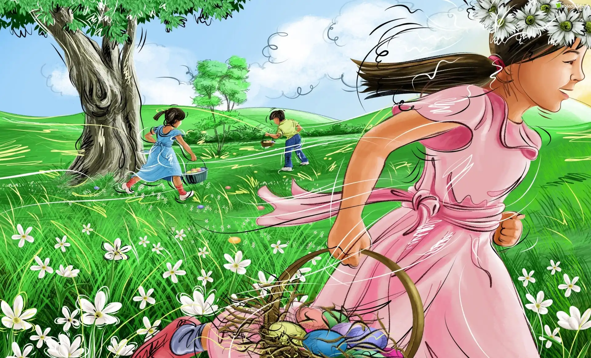 Zdjęcie, Dziewczynki, Koszyk, Pisanki