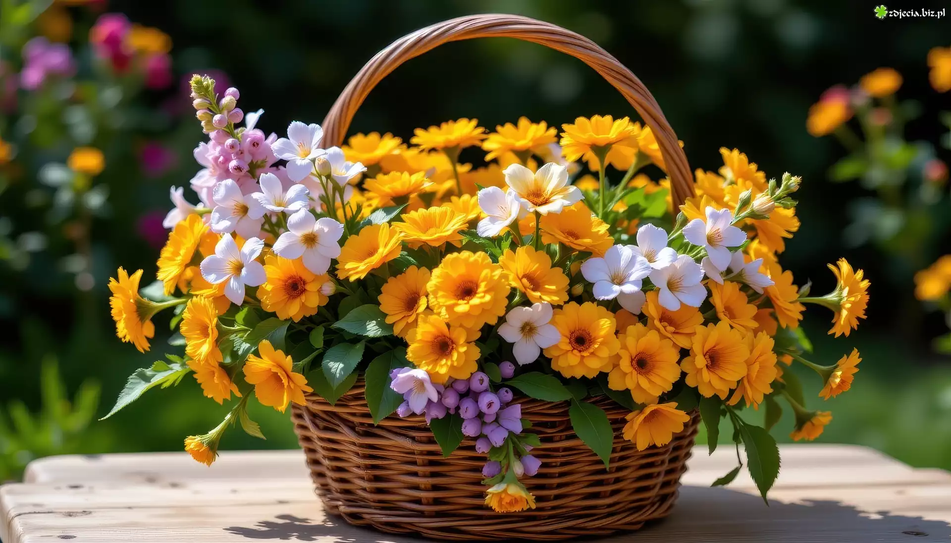 Zdjęcie, Kwiaty, Nagietki, Bukiet, Koszyk, Stół, Ogród