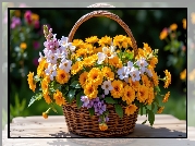 Zdjęcie Kwiaty, Nagietki, Bukiet, Koszyk, Stół, Ogród
