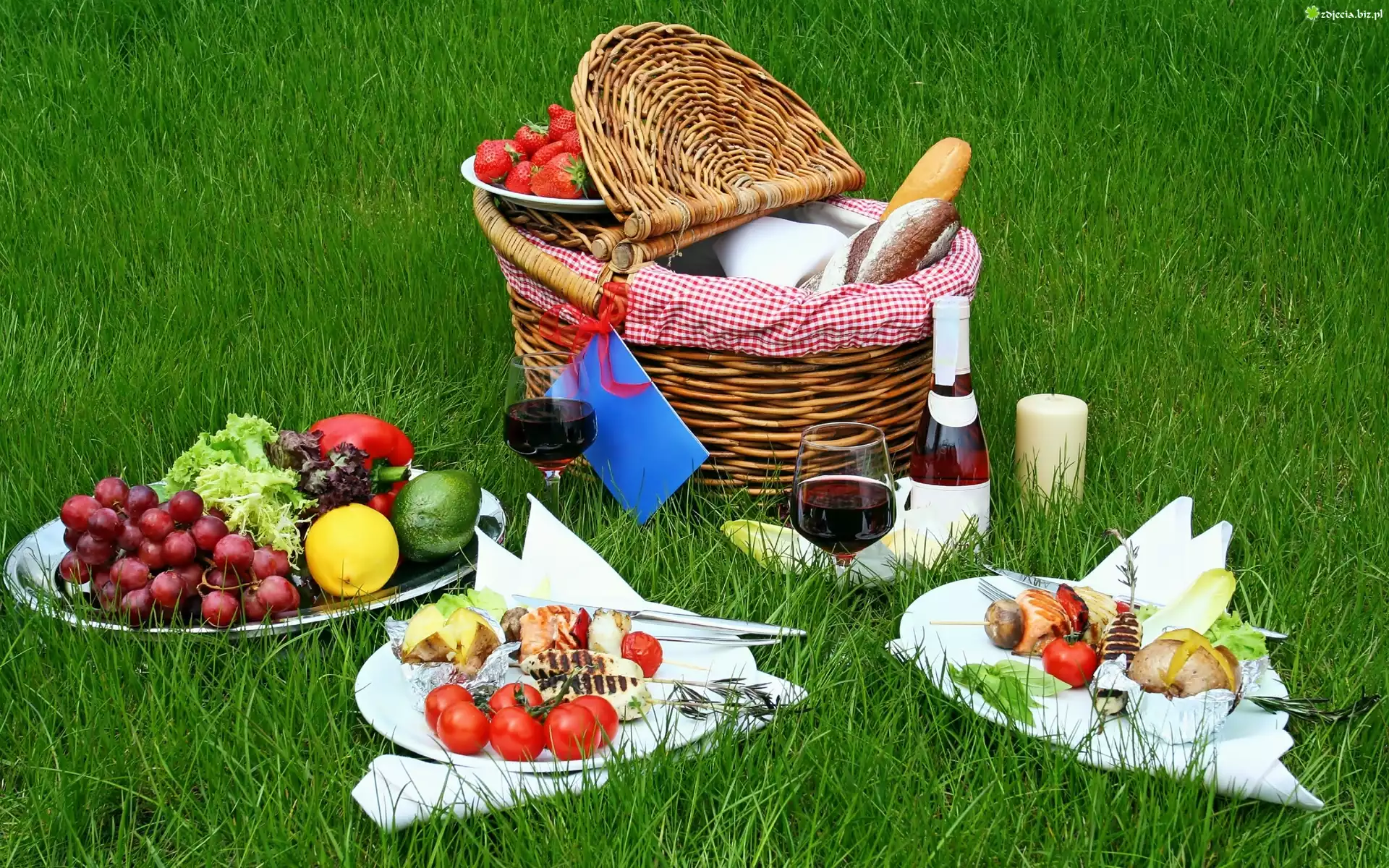 Zdjęcie Koszyk, Łąka, Wino, Warzywa, Owoce, Piknik