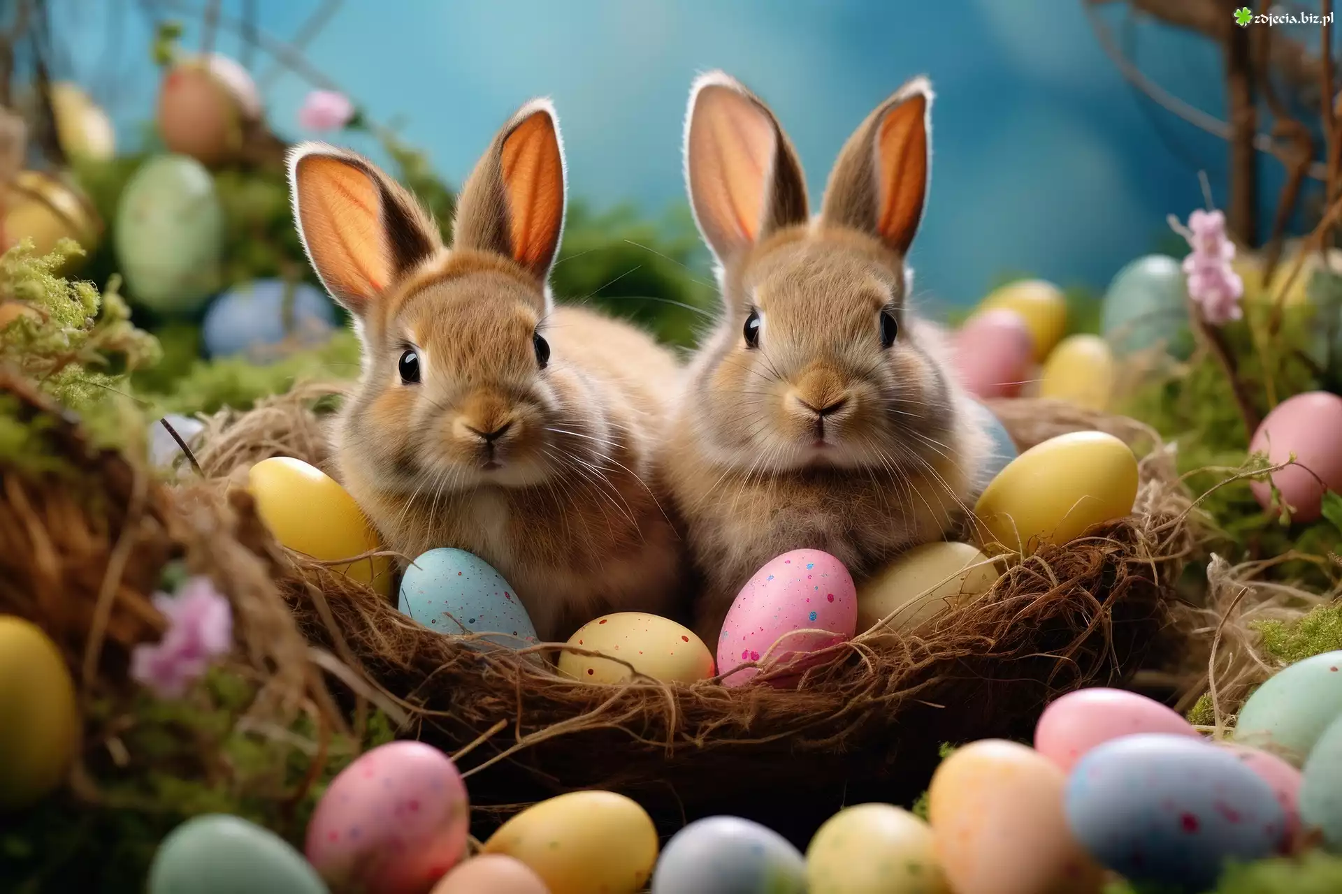 Zdjęcie, Króliki, Koszyk, Pisanki, Wielkanoc, Grafika