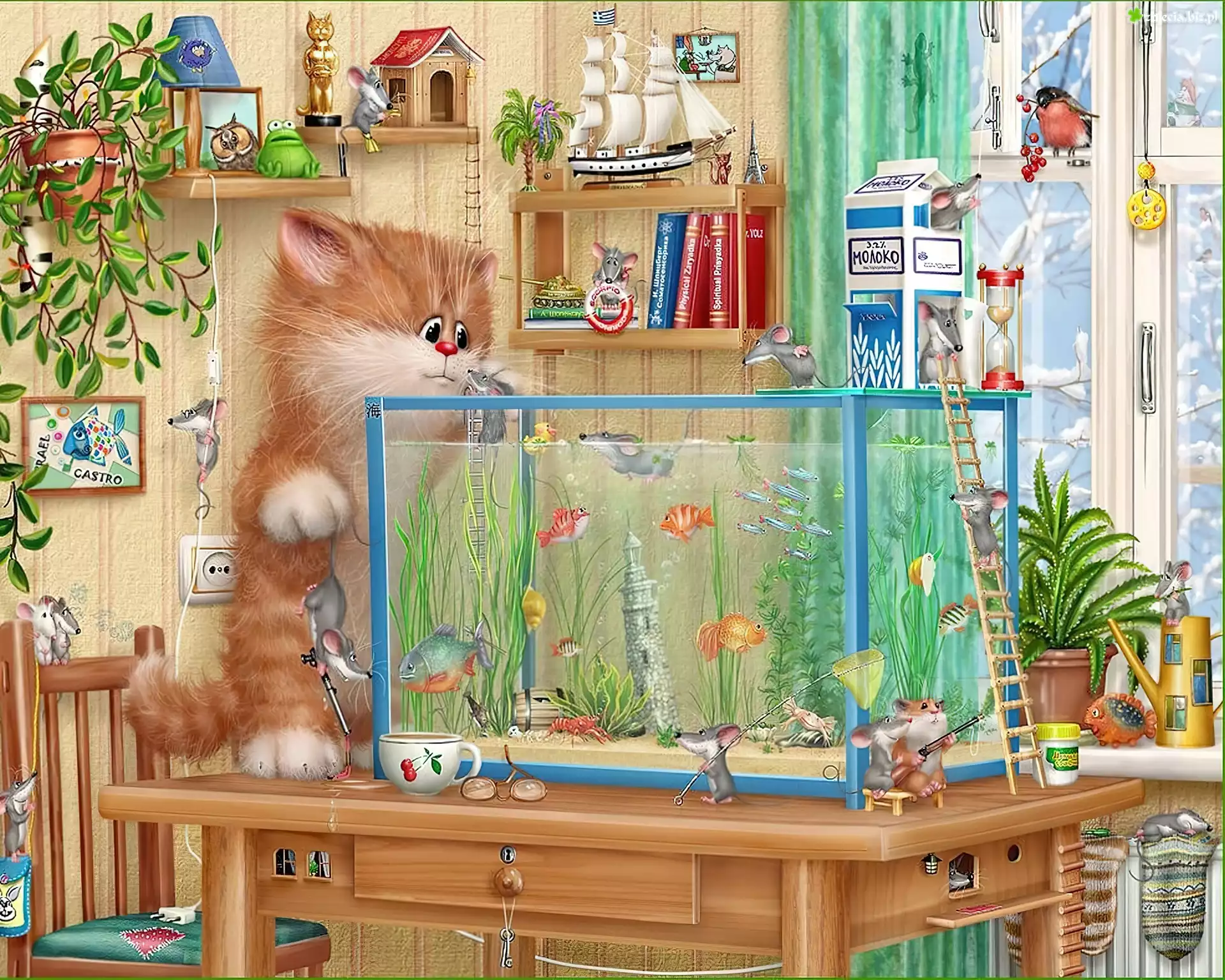 Zdjęcie Akwarium, Kot, Rybki, Pokój dziecięcy, Myszy, Półki, Książki