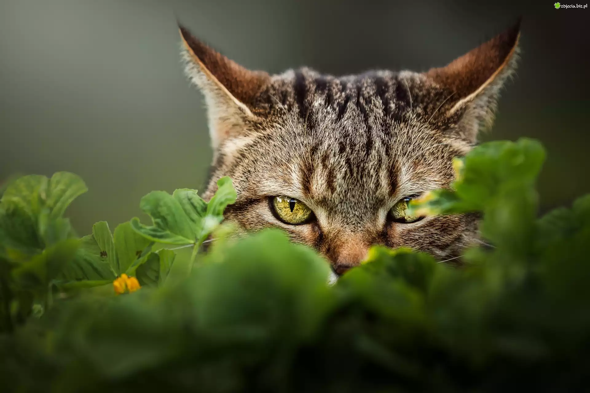 Zdjęcie Bury, Kot, Spojrzenie, Oczy, Liście, Żółty, Kwiatek