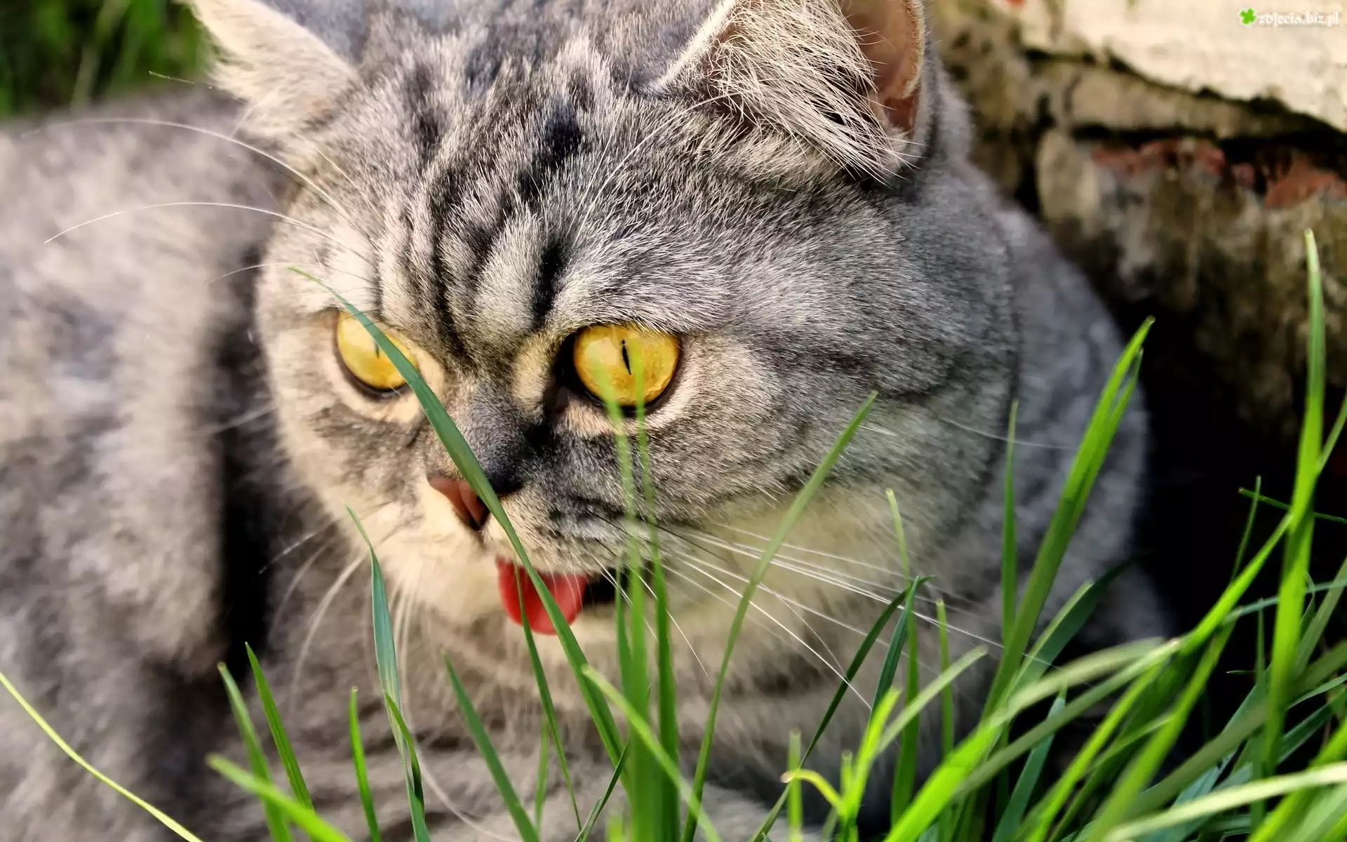 Zdjęcie Kot, Duże, Oczy, Język, Trawa