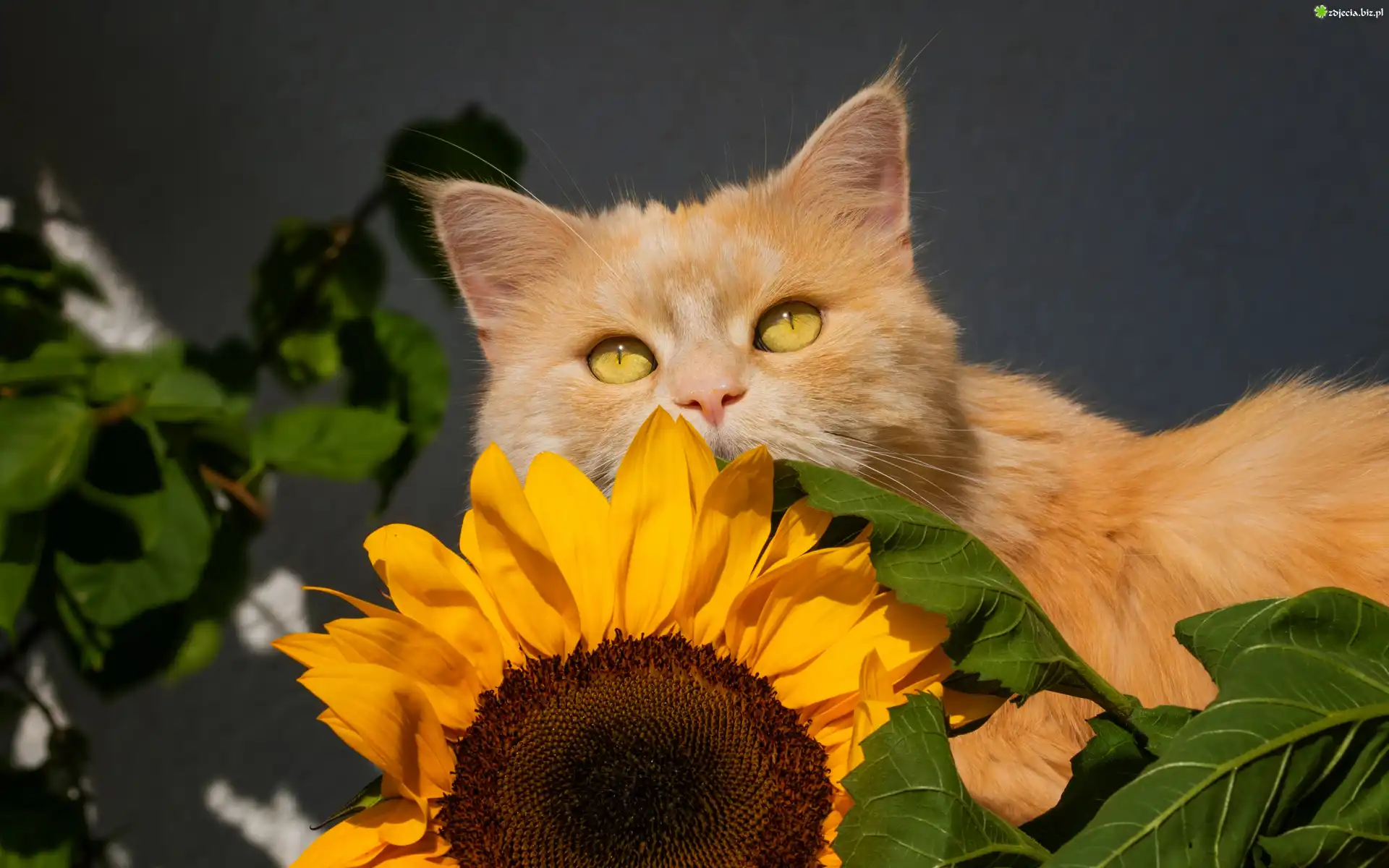 Zdjęcie Rudy, Kot, Spojrzenie, Żółte, Oczy, Kwiat, Słonecznik, Liście