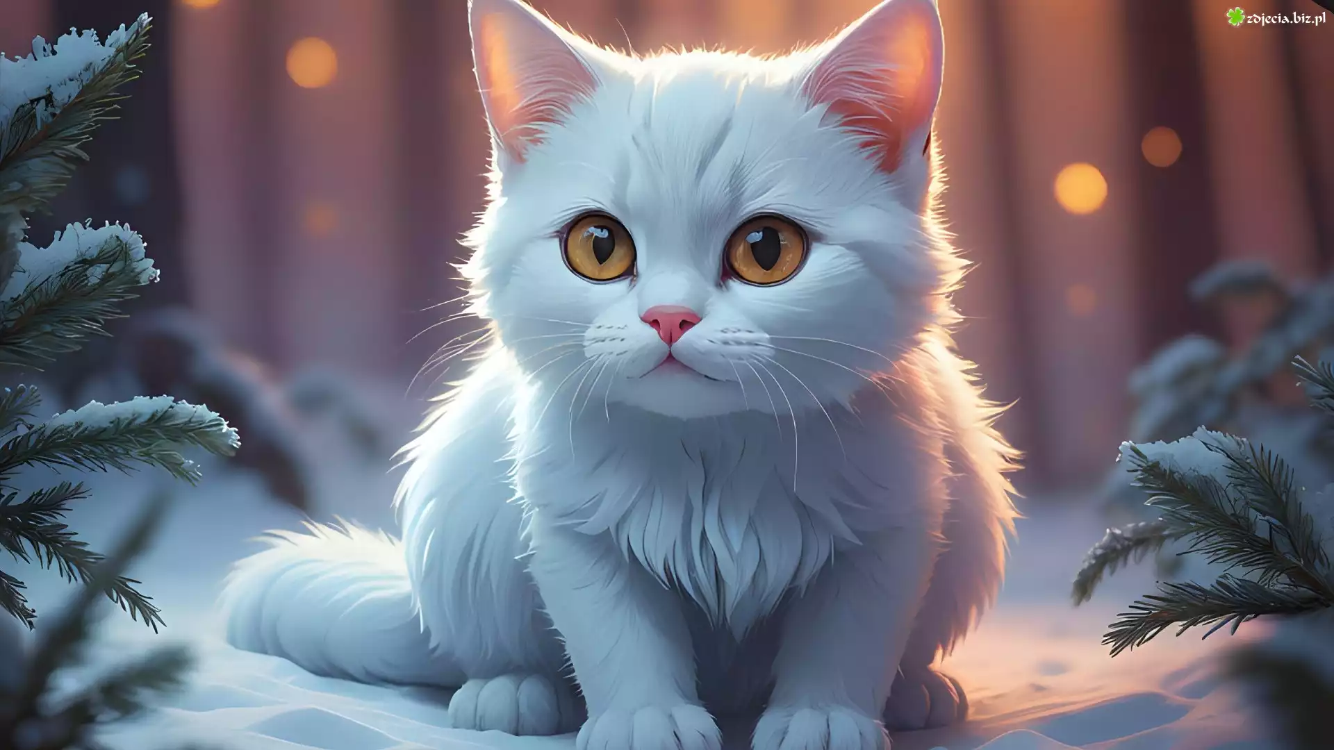 Zdjęcie Biały, Kot, Ośnieżone, Gałązki, 2D